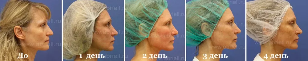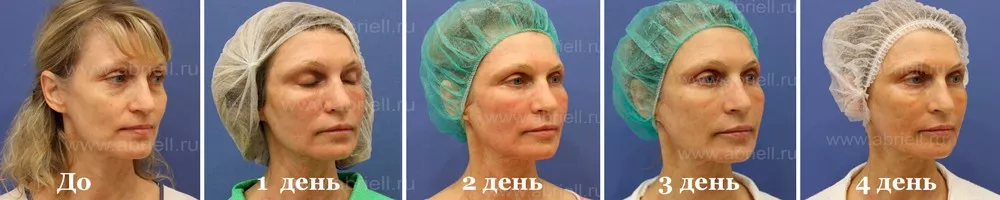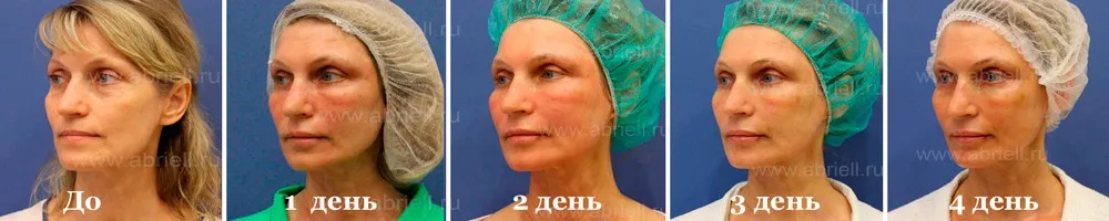 Изменения, которые претерпевает кожа, Вы можете видеть на фотографиях ниже. Отек после контурной пластики спадает в течение 3 дней. На протяжении 1-2 дней после фракционного омоложения наблюдается краснота. На 3-ий день образуются корочки. На 4-ый день корочки активно отшелушиваются. Затем на 6-7 день они отходят, кожа становится гладкой и приятной на ощупь, однако ее цвет сохраняет неоднородность. Через 10-14 дней кожа приобретает ровный оттенок.