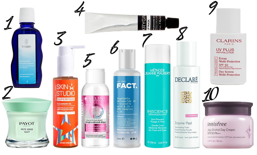 1 – оживляющий тоник для всех типов кожи Weleda, 2 – ночной крем против несовершентств кожи лица Payot, 3 – гидрофильное масло для очищения кожи Stellary Skin Studio, 4 – мультифункциональный бальзам-маска для губ Krygina Cosmetics, 5 – гиалуроновая мицеллярная вода Evelline Cosmetics, 6 – увлажняющий очищающий тоник для лица с аминокислотами, гликолевой кислотой и комплексом AHA-кислот Fact, 7 – очищающее молочко для лица и глаз Méthode Jeanne Piaubert, 8 – мягкий энзимный пилинг для лица Declare, 9 – защитный флюид-экран для лица с SPF 50, Clarins, 10 – Омолаживающий дневной крем с экстрактом орхидеи Innisfree