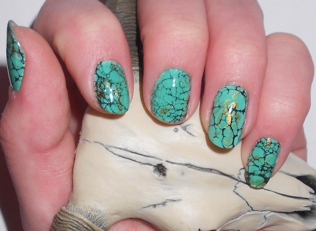 Такой яркий вариант мраморного маникюра придется по душе любительницам украшений из бирюзы.