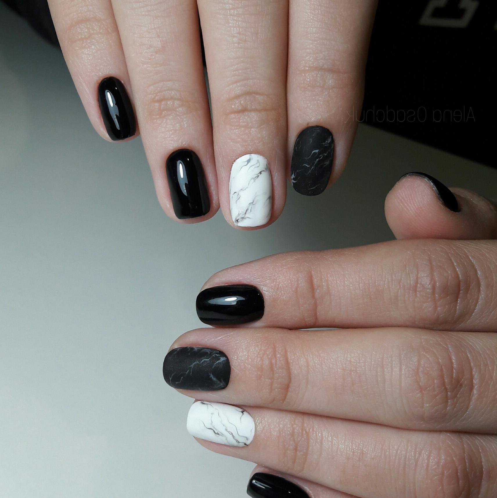 Тем, кто хочет спокойный маникюр стоит обратить внимание на комбинированный. А те, кто не боится рисковать можно в мраморный черный добавить немного золотой фольги