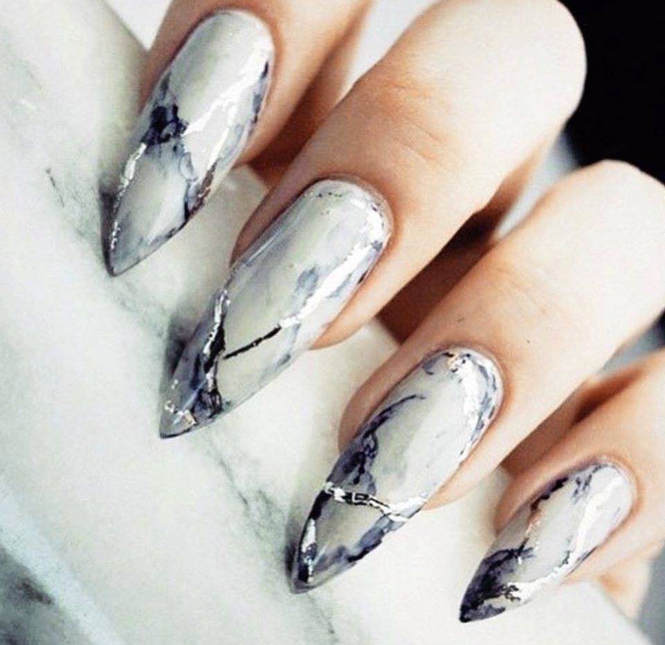 Необычная форма ногтей и декорирование камнями сделает ваш мраморный маникюр невероятно модным и стильным.