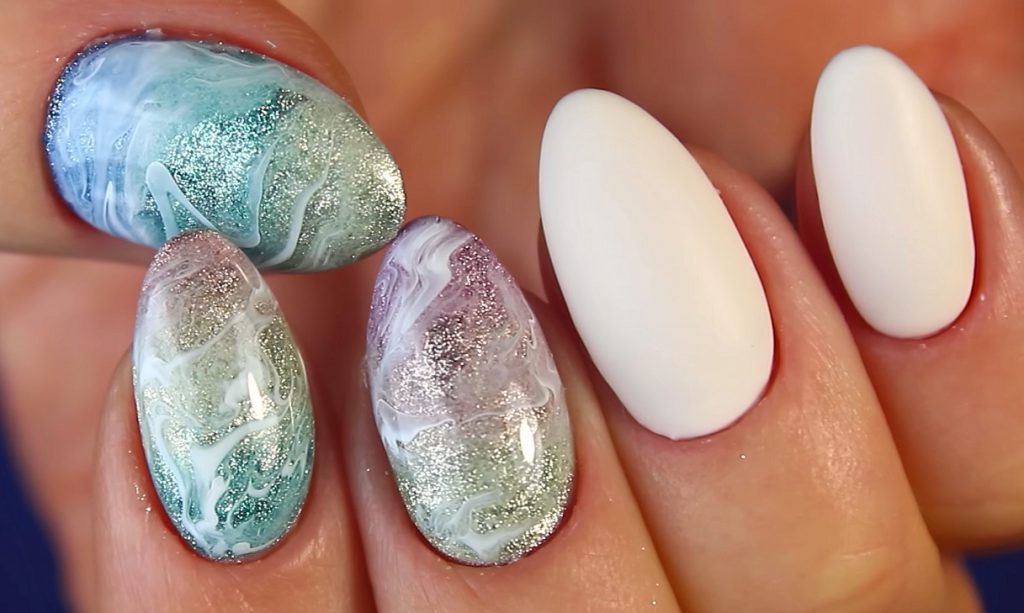 Оттенки цвета морской волны потрясающе смотрятся в мраморном дизайне ногтей.