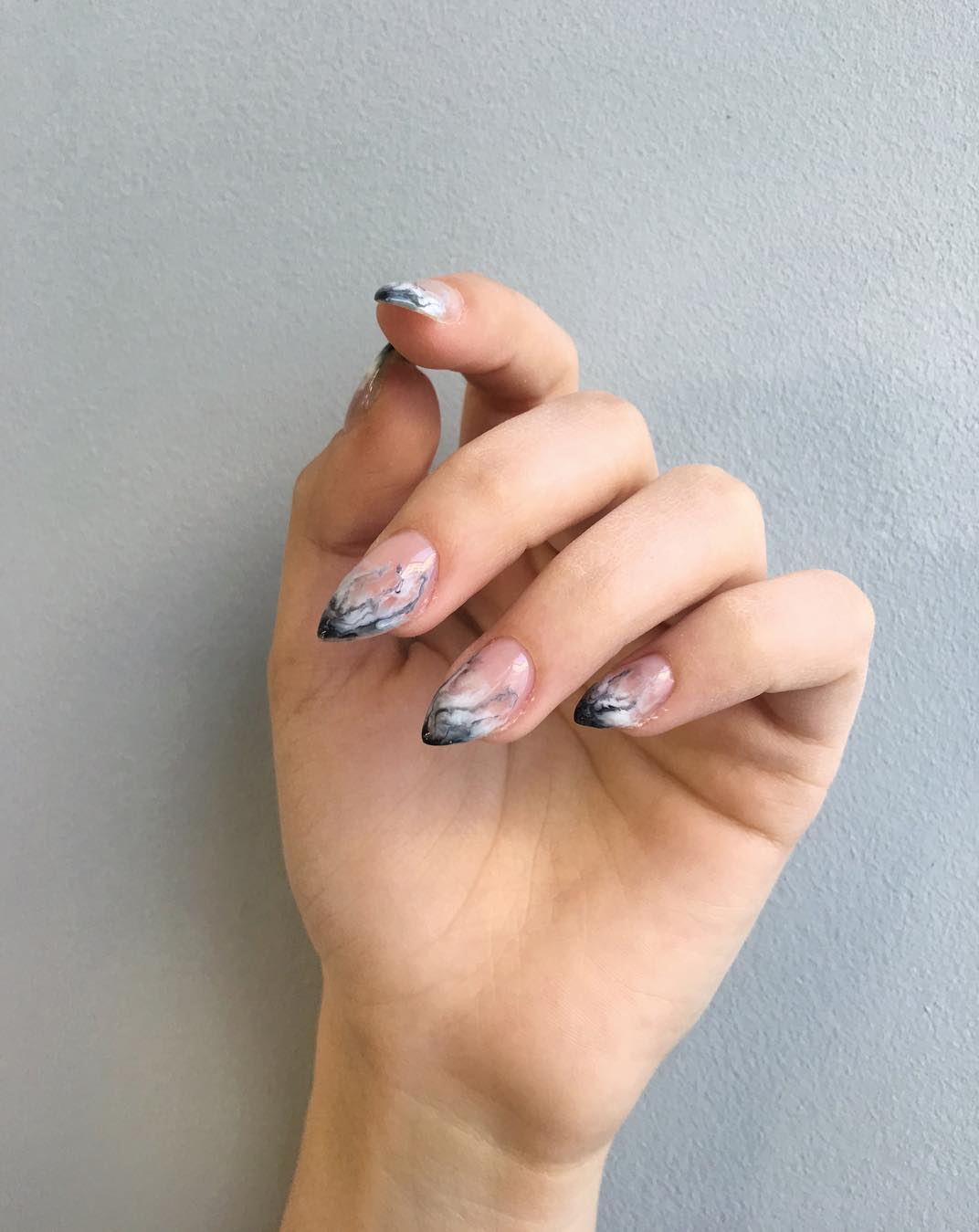 Обратите внимание на интересную вариацию французского маникюра с помощью мраморного эффекта. Мраморный маникюр в серой гамме очень сдержан и элегантен. Отличная идея повседневного маникюра!