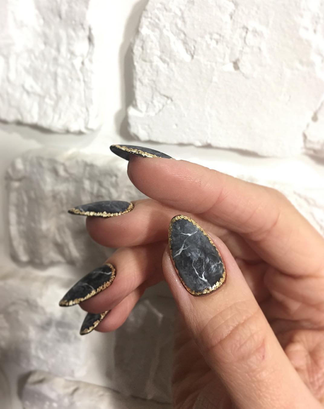 Благородный мраморный маникюр в сером цвете с золотыми прожилками.