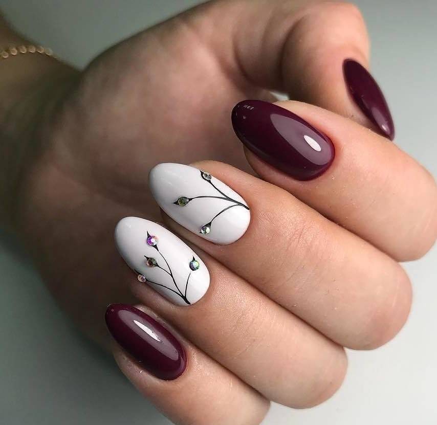 Контрастный маникюр: волшебный бордо, белый, изящный штрих как японский мотив: просто, изысканно и очень геометрично.
