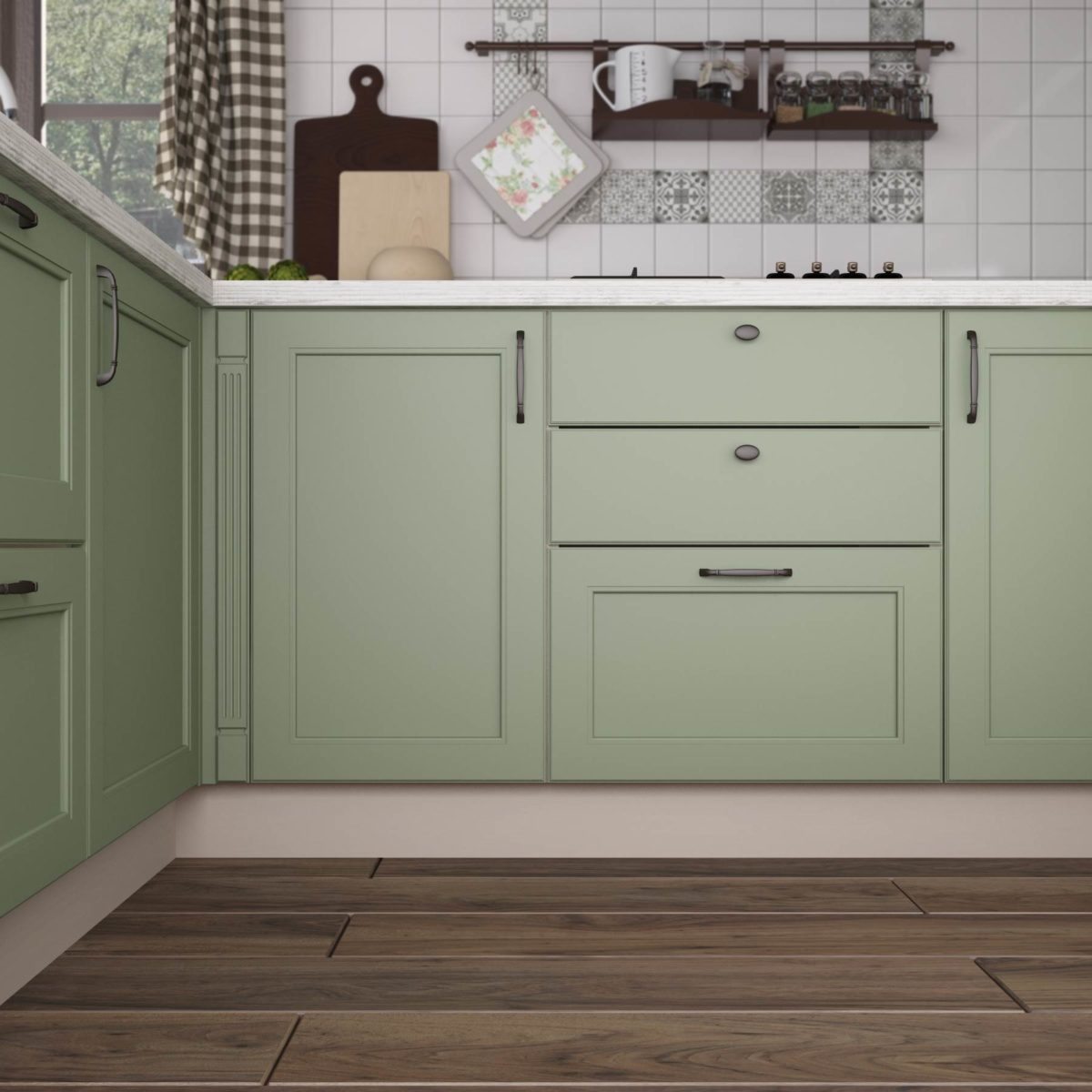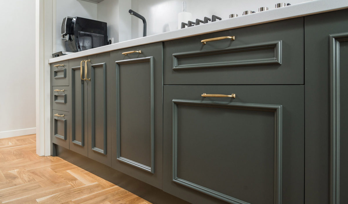 Фасад из фольги — самое доступное решение. В этом случае на фасады МДФ наклеивается специальная пленка с имитацией матовой текстуры. Пленка ПВХ не имеет кромок, подходит для нанесения на фасады любой конфигурации: плоские и фрезерованные.