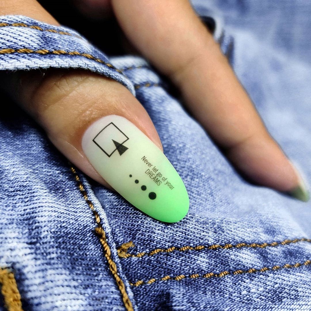 Если выбирать маникюр с рисунком, то предпочтение можно отдать тонким линиям, ассиметричной геометрии или «лунной» технике, которые визуально вытянут «вытянут» ноготок.