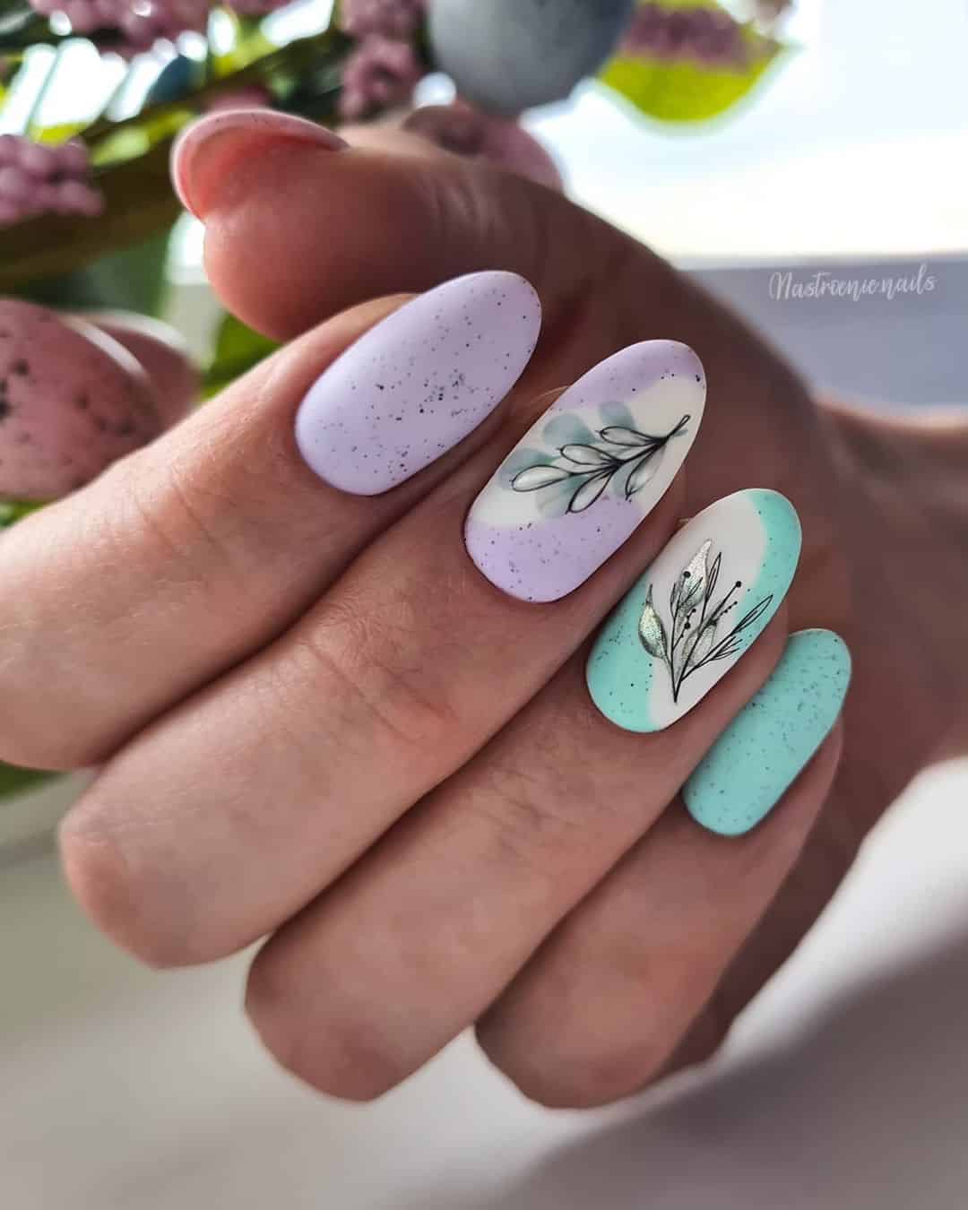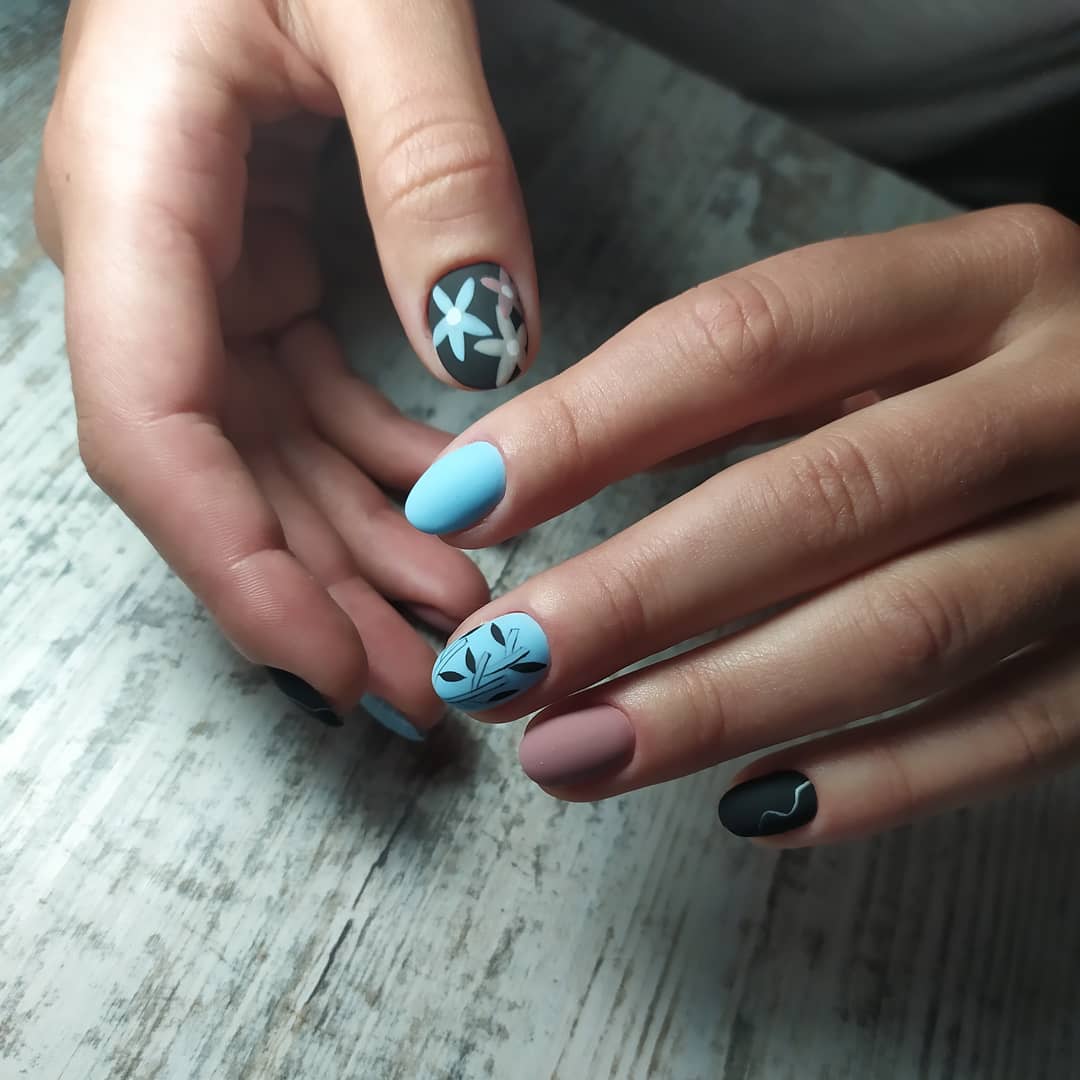 Очень красивым и нежным получается матовый маникюр на миндальную форму ногтей, даже если выбрать яркие тона. Их цвет получится более приглушенным, а разнообразить дизайн помогут флористические мотивы.