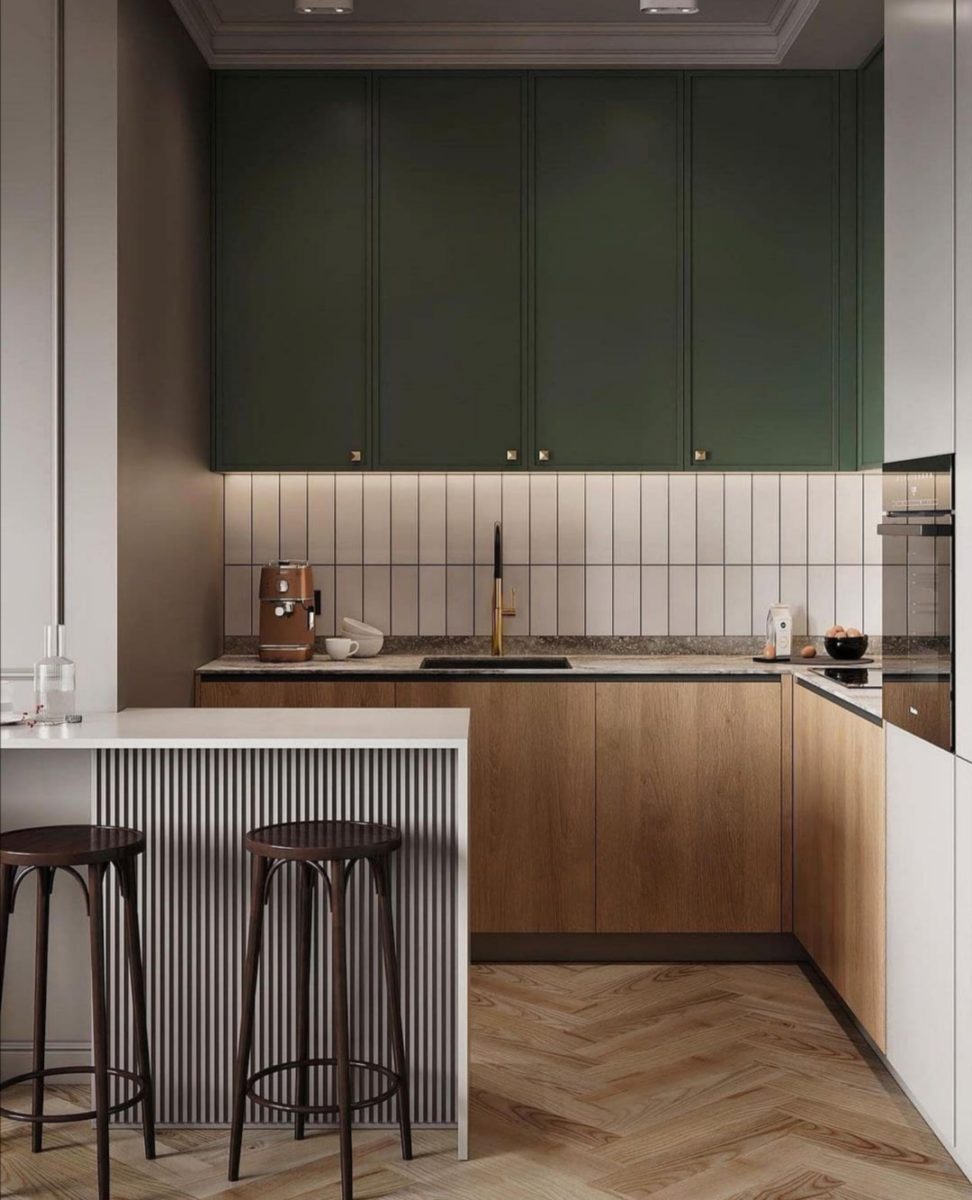Фасады кухни красить эмалью проще, а разнообразие матовых и зеркальных оттенков с применением дополнительного перламутрового блеска, металла, переливов глиттера может сделать дизайн неповторимым.