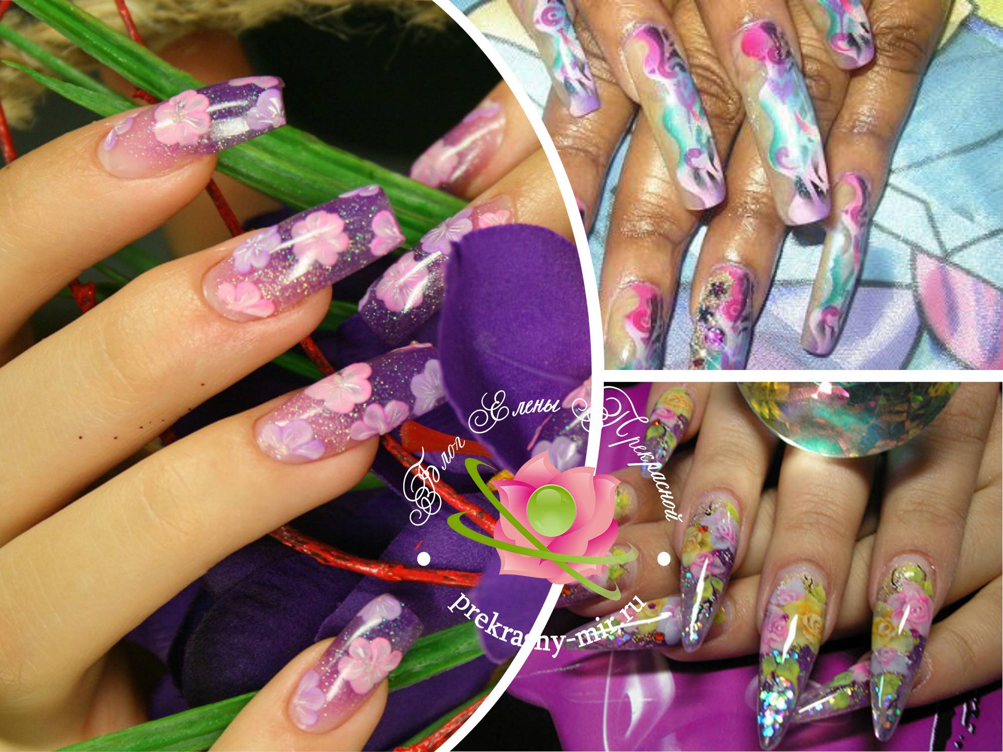 Как мы уже упоминали, длина ногтя в данном случае не важна, поэтому даже на коротких наращенных ногтях можно выложить оригинальные рисунки: объемные изображения рыбок, водорослей, камушков, замков, кораблей, цветов, ракушек, птиц и зверей, украшенные стразами, блестками, песком, кружевом. Покрытые аквариумным стеклом, акрилом или гелем, их просто невозможно повредить, в отличие от объемного дизайна.