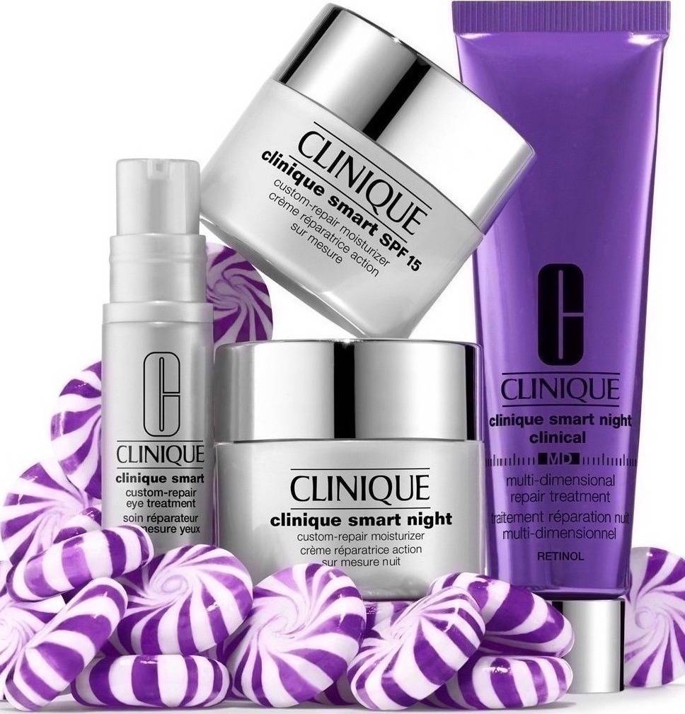 Ещё одна линейка антивозрастного ухода серии люкс от компании Клиник – это восстанавливающая продукция для лица Clinique Smart. Рейтинг этой серии открывает интеллектуальная сыворотка Smart Custom-Repair Serum. Далее по популярности идут дневной и ночной крем, и уход за кожей вокруг глаз. В составе этих кремов заявлены гиалуроновая кислота, белок молочной сыворотки, экстракт дрожжей, масло мурмуру, соевый белок, экстракт водорослей, ячменя, огурца и т.д.