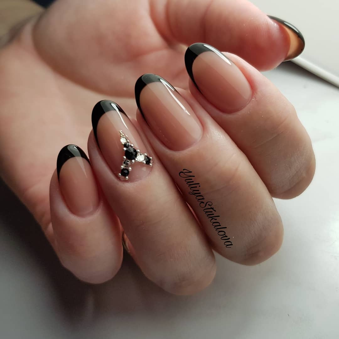 Если ими выложить обратный френч, результат получится восхитительным, особенно шикарно смотрится сочетание чёрного с золотом или серебром.