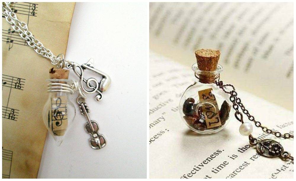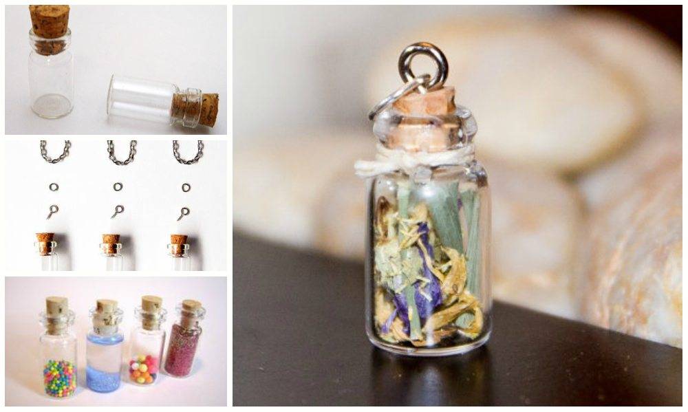 - Красивым и стильным украшением может стать кулон, изготовленный из миниатюрной стеклянной бутылочки с пробкой. Купить такие изящные заготовки можно в популярных китайских магазинах, например AliExpress, стоимость их менее 3 $ за 10 штук.