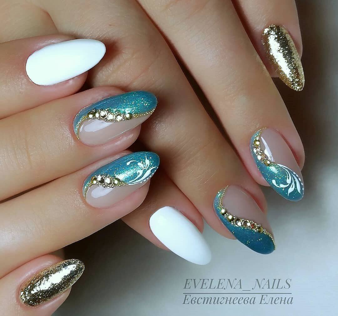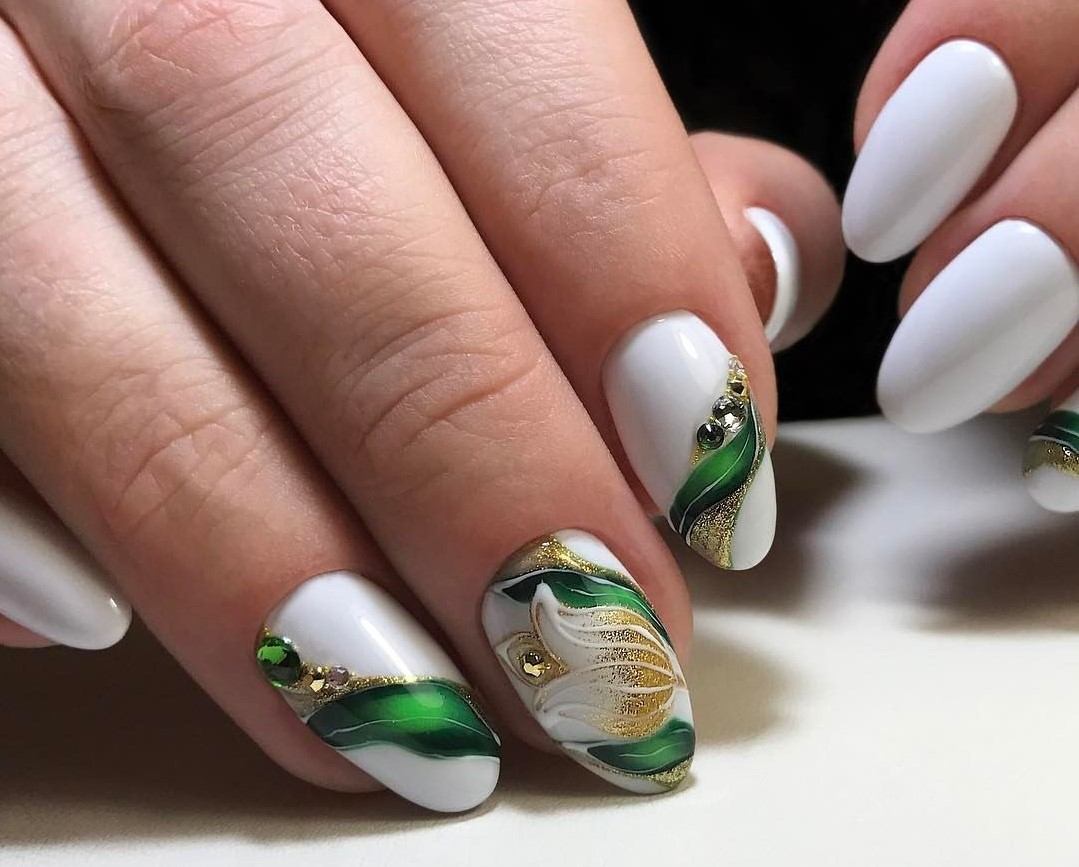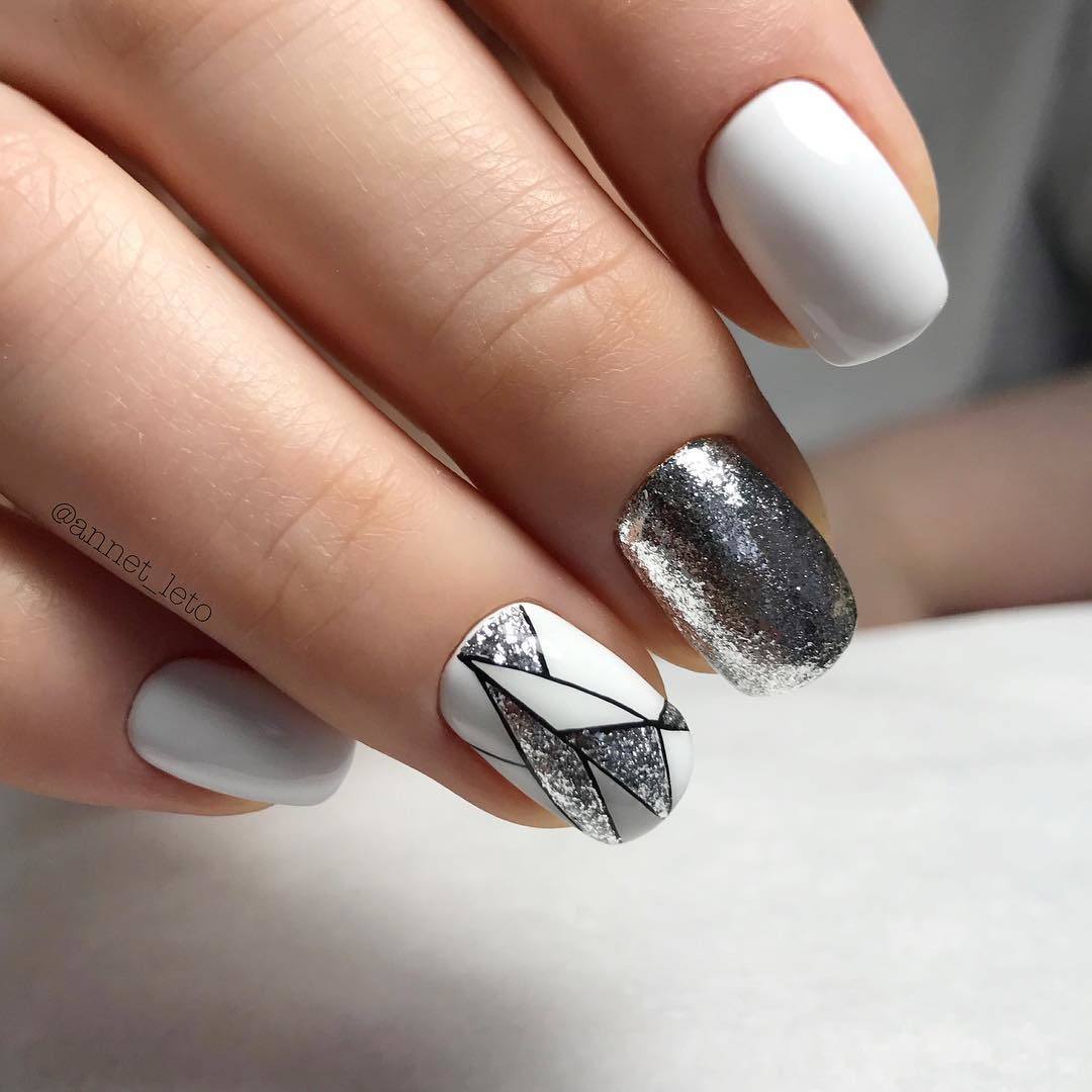 На белой основе выразительно, эффектно и интересно будут смотреться практически любые узоры. В текущем сезоне 2021-2022 гг. особую актуальность приобрела геометрия с ее четкими, прямыми линиями. Для реализации подобных идей можно использовать различные техники и способы декорирования – штампы, тончайшие кисти, фольгированные ленты и т.д. Выбор рисунка целиком и полностью остается за вами. Это могут быть ромбы, полоски, зигзаги, треугольники и любые другие фигуры. Для придания акцентов и интересных деталей нейл-арт может украсить блестками, стразами или кусочками фольги.