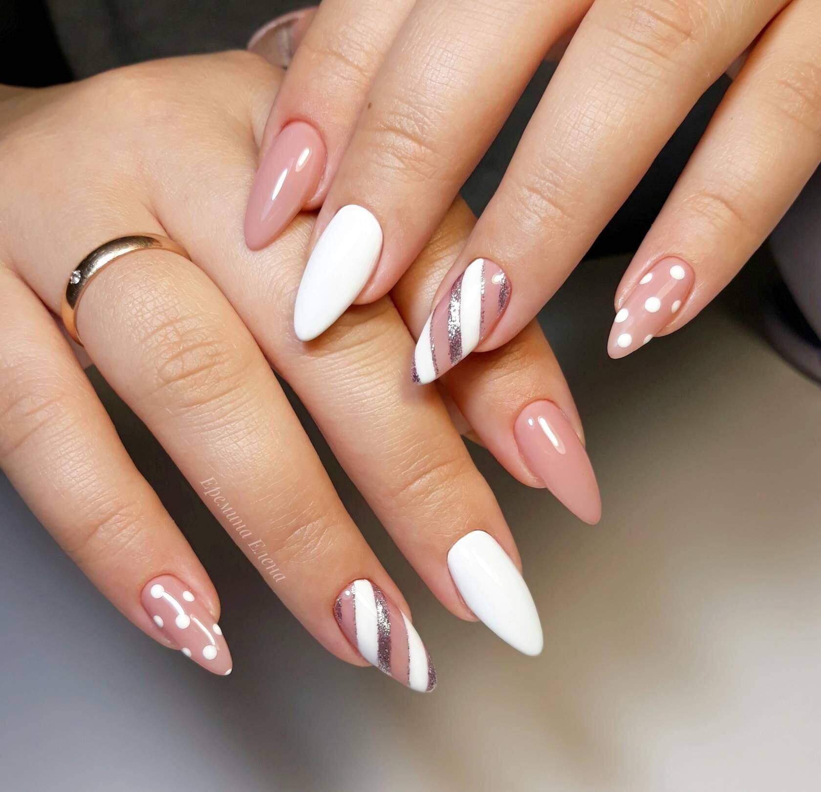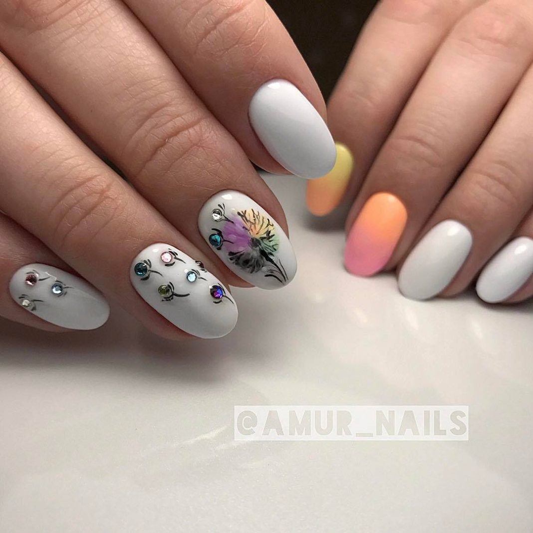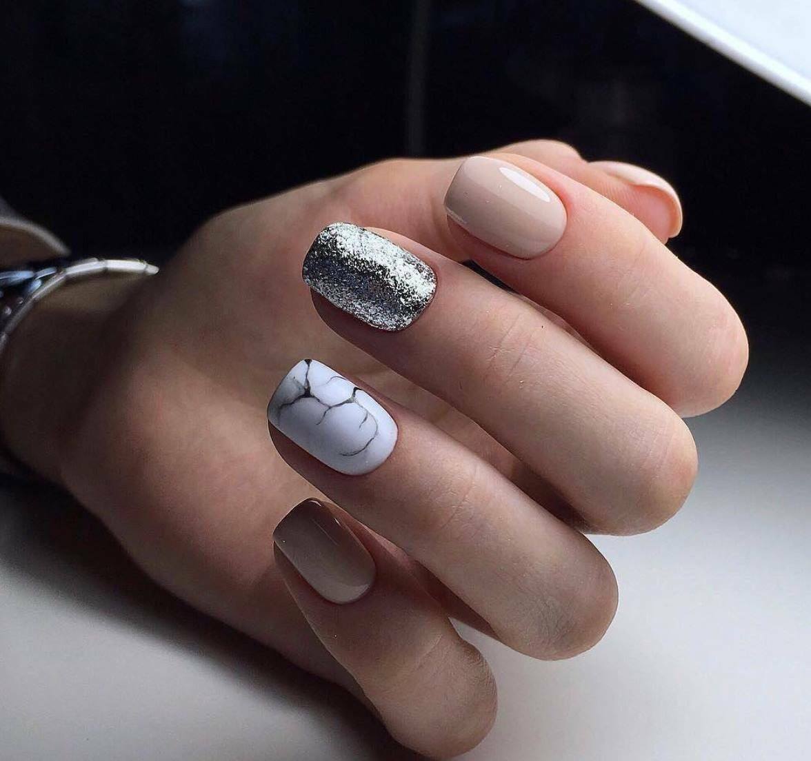 Белый в сочетании с другими нейтральными оттенками, например, с бежевым, персиковым, серым или пудровым сделает дизайн ногтей более романтичным и нежным. Оформление здесь может быть любым. Чаще всего девушки предпочитают покрыть все ноготки разными цветами.