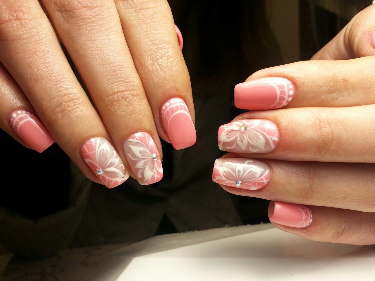 Для длинных ногтей с белым матовым покрытием декорирование является обязательным элементом маникюра. Это могут быть переливающиеся капельки страз, флористические лепные украшения, глиттер и т.д. Чтобы добавить образу женственности и романтичности на нескольких ногтях можно прорисовать тончайший кружевной орнамент, причем он может быть как контрастным, так и выполненным из светлых оттенков. В последнем случае «вуаль» добавить маникюру объем и выразительность.