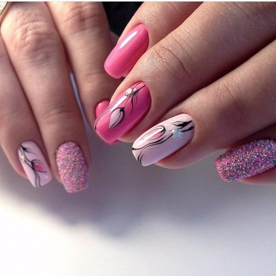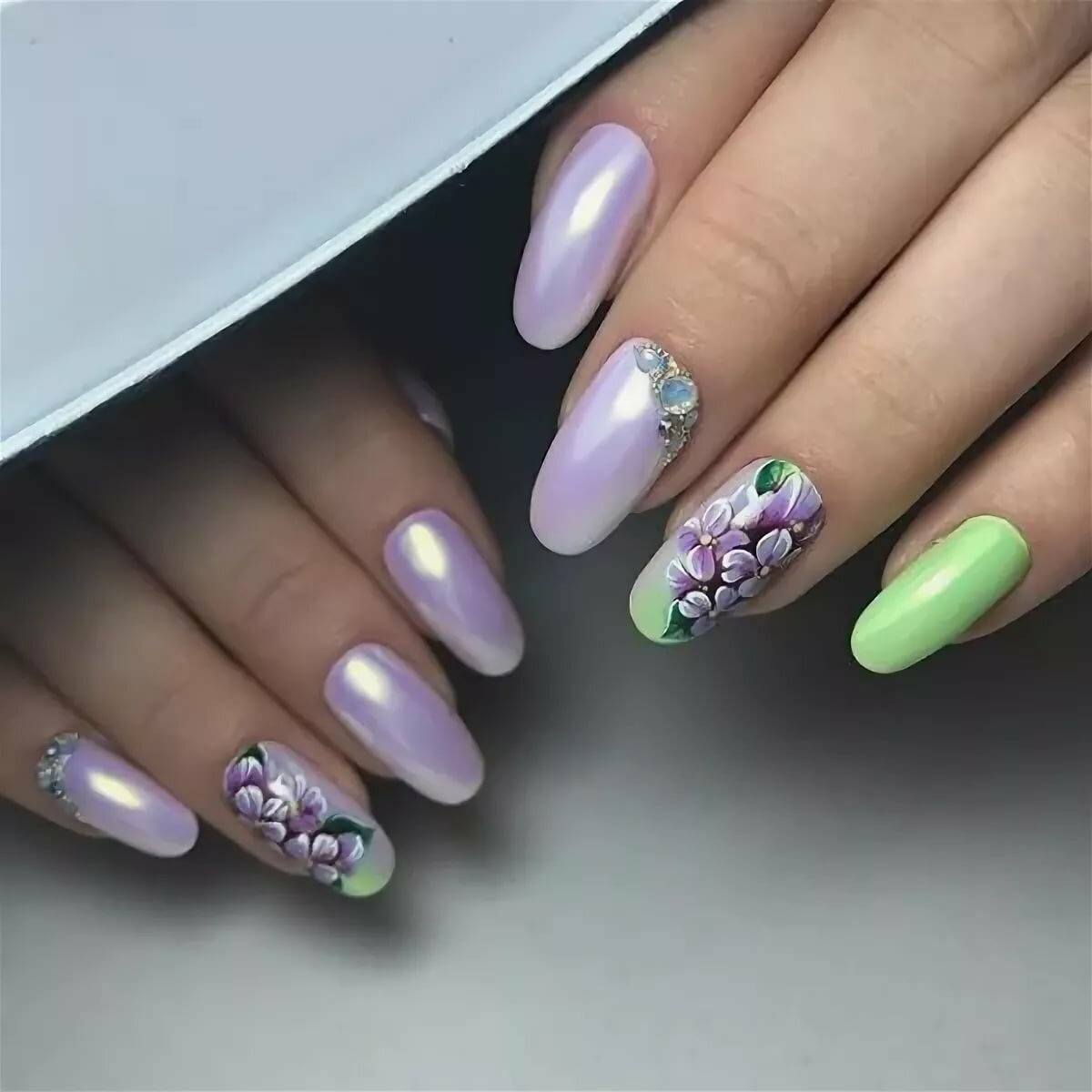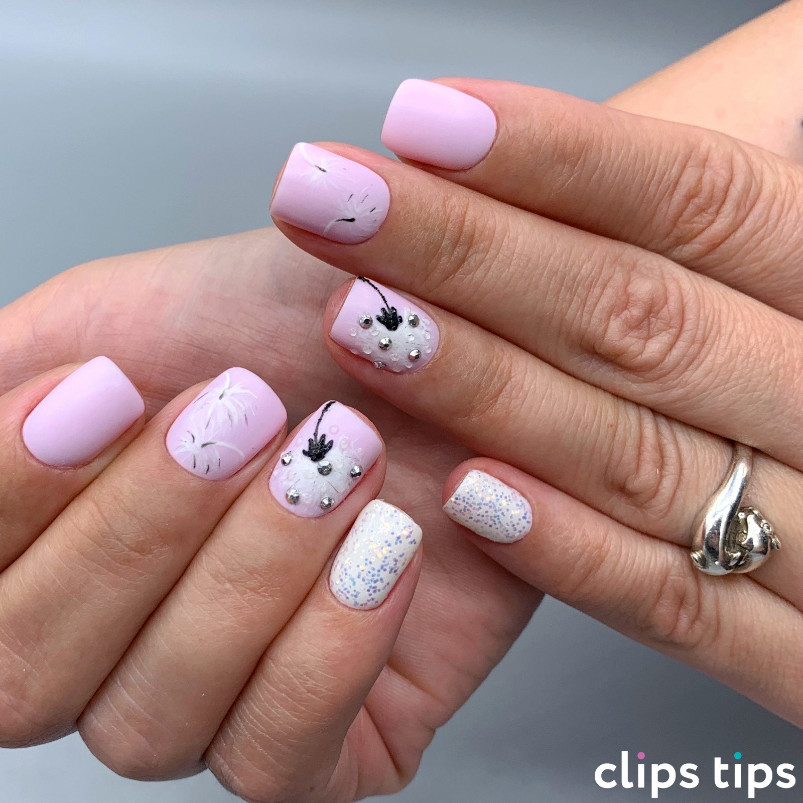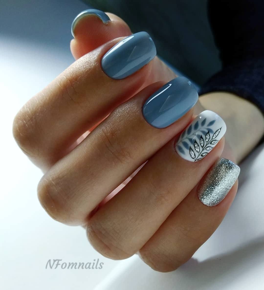 В тренде сочетание блестящего декора и геометрии. Стильно смотрятся полоски посередине ногтя, выполненные серебром. Для весеннего и летнего нейл-арта выбирайте флористику с веточками и листочками, выделенными глиттером. Используйте в молочном маникюре как глиттер, так и стразы, но в умеренных количествах. Такой дизайн отлично впишется в деловые и повседневные образы.
