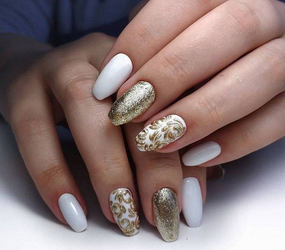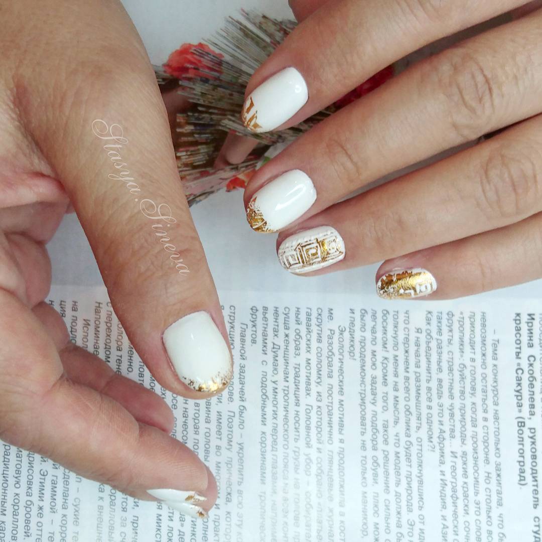 На белоснежном фоне можно поиграться с оттенками фольги. Самые популярные варианты: золото и розовое золото. Фольгу можно тоже заматировать или оставить блестеть. К ней подойдут мелкие блестки и графичные узоры.