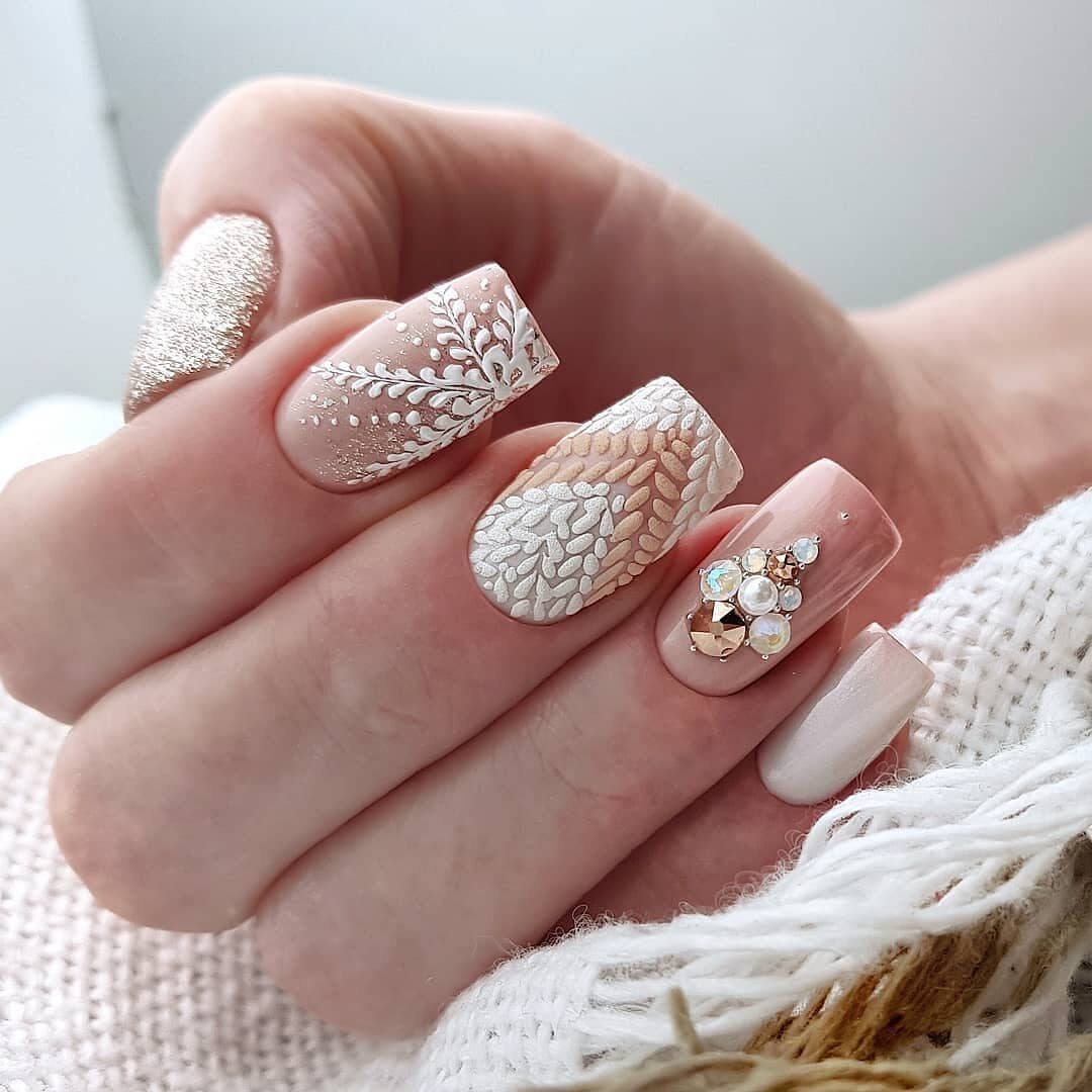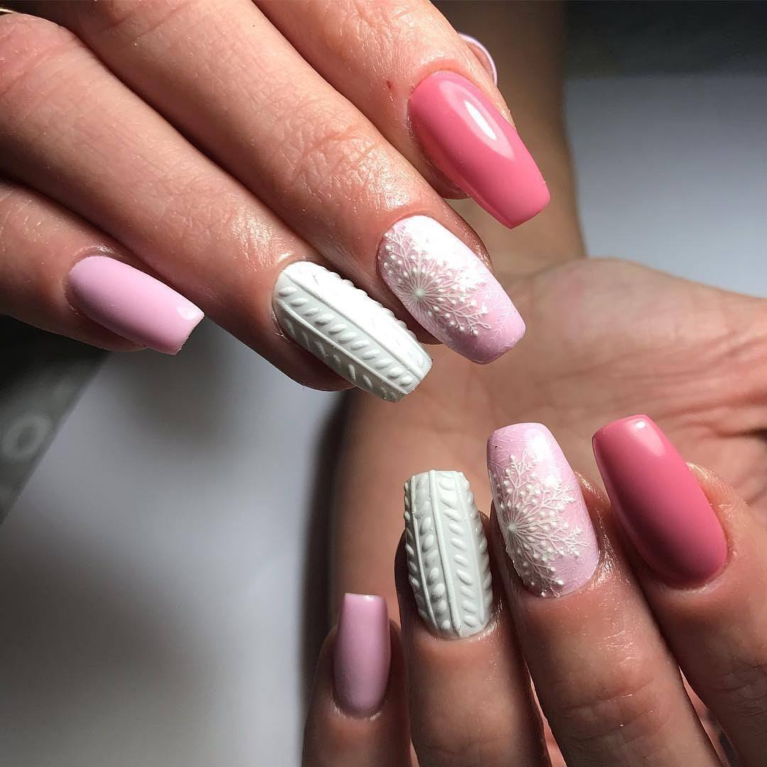 Используйте для новогоднего декора серебряный глиттер, золотые или серебряные стразы. Великолепно смотрится сочетание с серым, розовым оттенками. Еще один шикарный дизайн в белом цвете – это «вязаный». Он смотрится одновременно шикарно и повседневно. С «вязаным» дизайном ногтей вы можете отправиться как на работу в офис, так и на новогодний корпоратив.