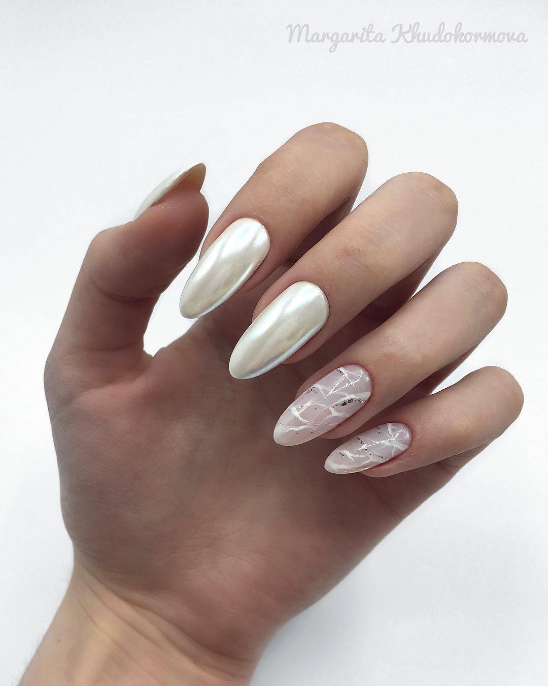 Мрамор снежного цвета можно сделать с черными, зелеными, золотыми или розовыми прожилками. Камень может находиться на одном или нескольких ногтях, а в целом сделан в цвет прожилок. Матовые бесцветные ногти с белыми прожилками подойдут для тех, кто не любит яркие варианты.