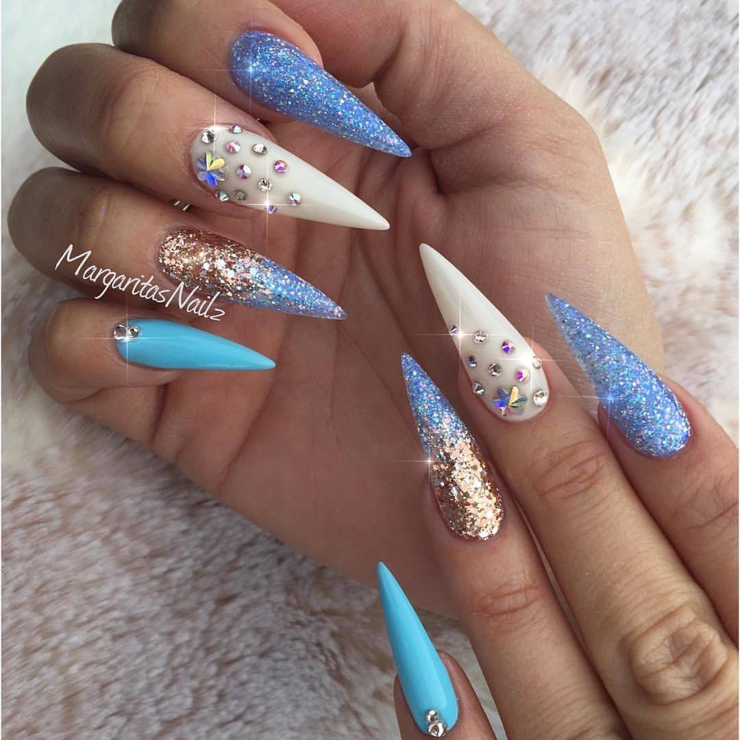 Этот популярный, стильный и красивый прием никогда не утратит своей популярности в сфере нейл-арт индустрии. Известные и модные тенденции делятся на два типа – эффект градиента белого цвета с плавным переходом в блестки, а также растягивание сверкающих блесток на ногтевой пластине, покрытой белым тоном. При этом в любом из вариантов можно использовать блестки разного цвета и формы. Омбре, выполненное при использовании блесток, очень хорошо сочетается с отдельными длинными и острыми ноготками, покрытыми полностью сверкающим декором.