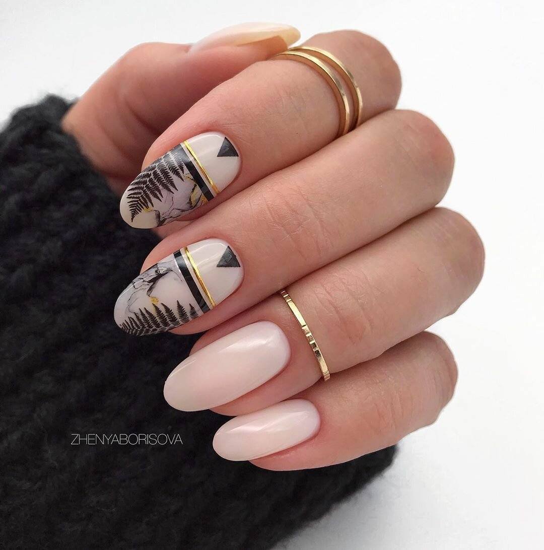 - Если ваши ногти круглой или овальной формы, то лучше отдать предпочтение цветочному или тропическому принту. В случае с квадратными ногтями, идеальным вариантом станет геометрический узор.