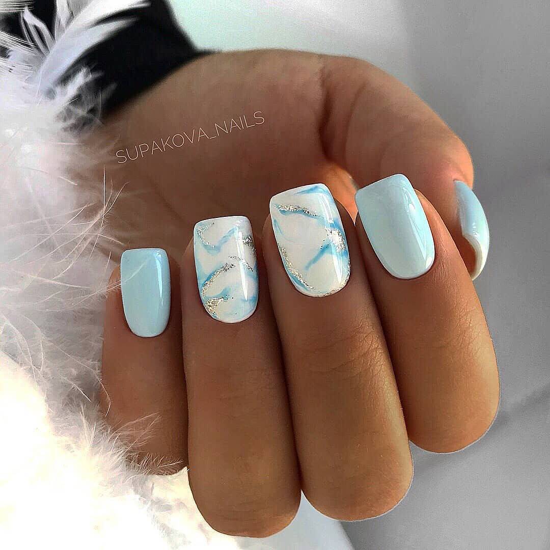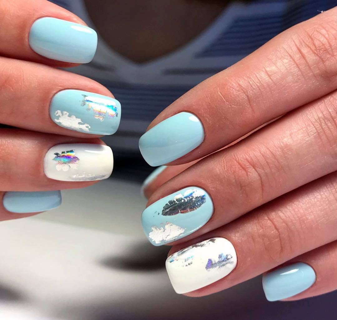 Белый с голубым или синим – это очень нежное сочетание цветов. Для дизайна ногтей могут быть использованы как цветные стразы на белом фоне, так и роспись или наклейки.