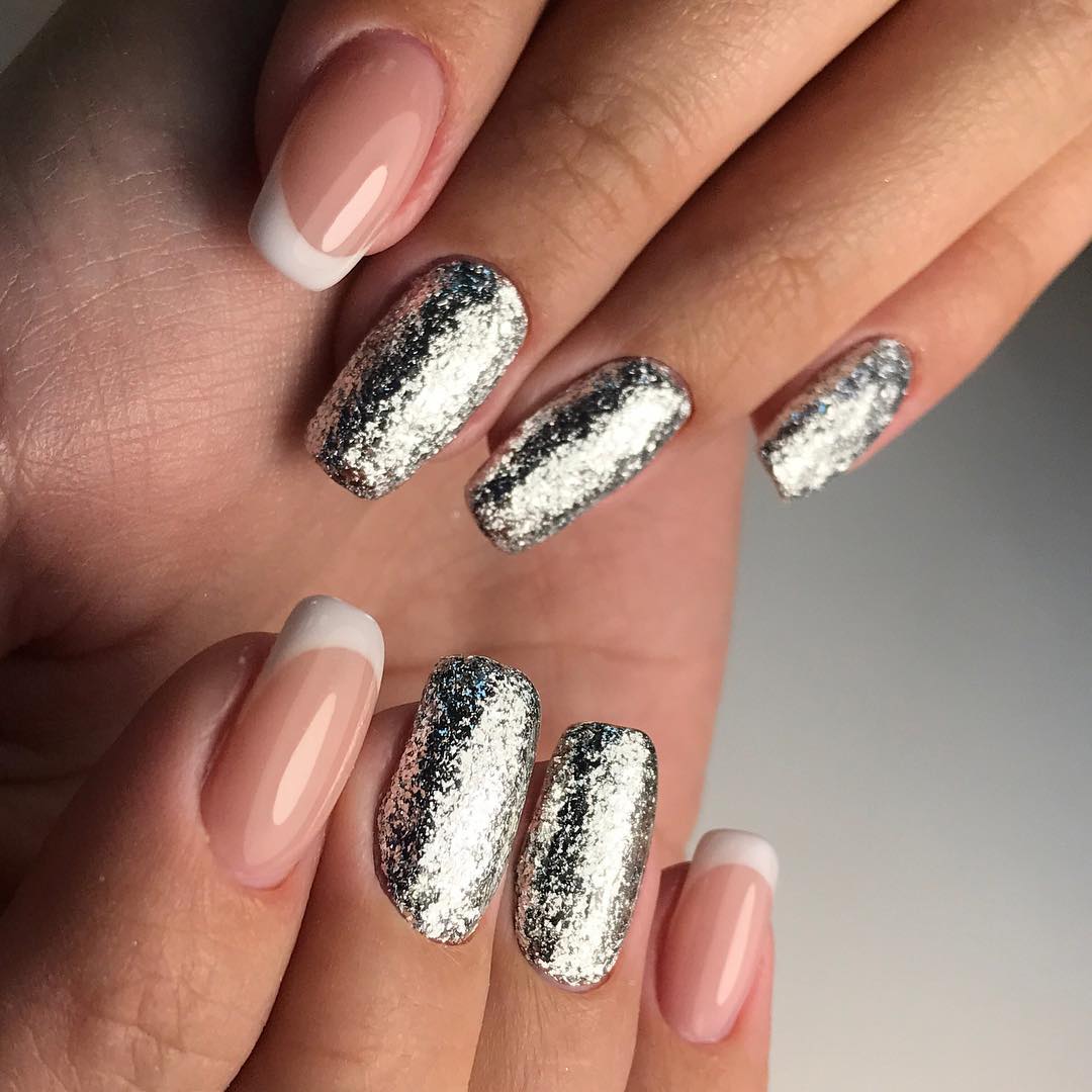 Серебряный глиттер – лучшее дополнение любого оттенка гель-лака. В сочетании с молочным цветом глиттер смотрится весьма оригинально и стильно. В тренде покрытие глиттером безымянного пальца, растяжка серебряными блестками.