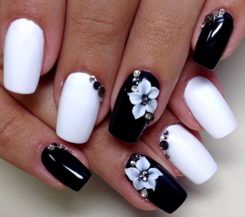 Черно-белый маникюр также часто выбирают модницы для создания лука на каждый день. На белый фон может быть нанесен черный рисунок, чаще всего это лишь его контур, геометрический узор или орнамент.