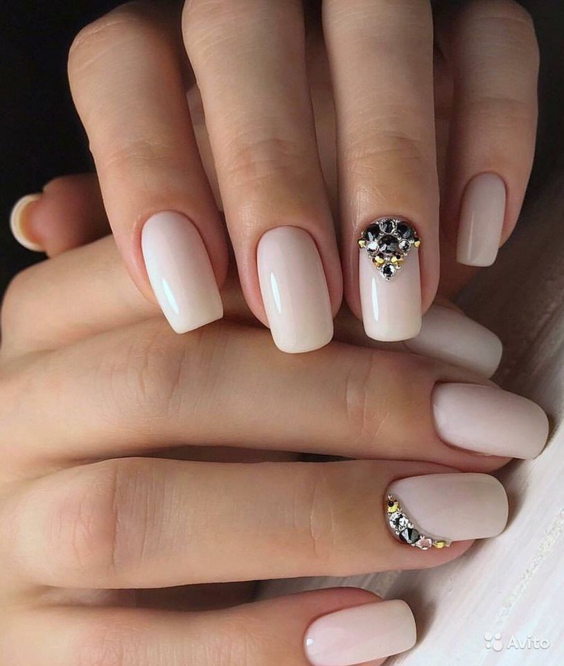 Добавление ярких камней к покрытию без блеска — отличный вариант дизайна. Выделите нижнюю часть ногтя маленьким стразом или разделите пластину по центру полоской из мельчайших бриллиантов.