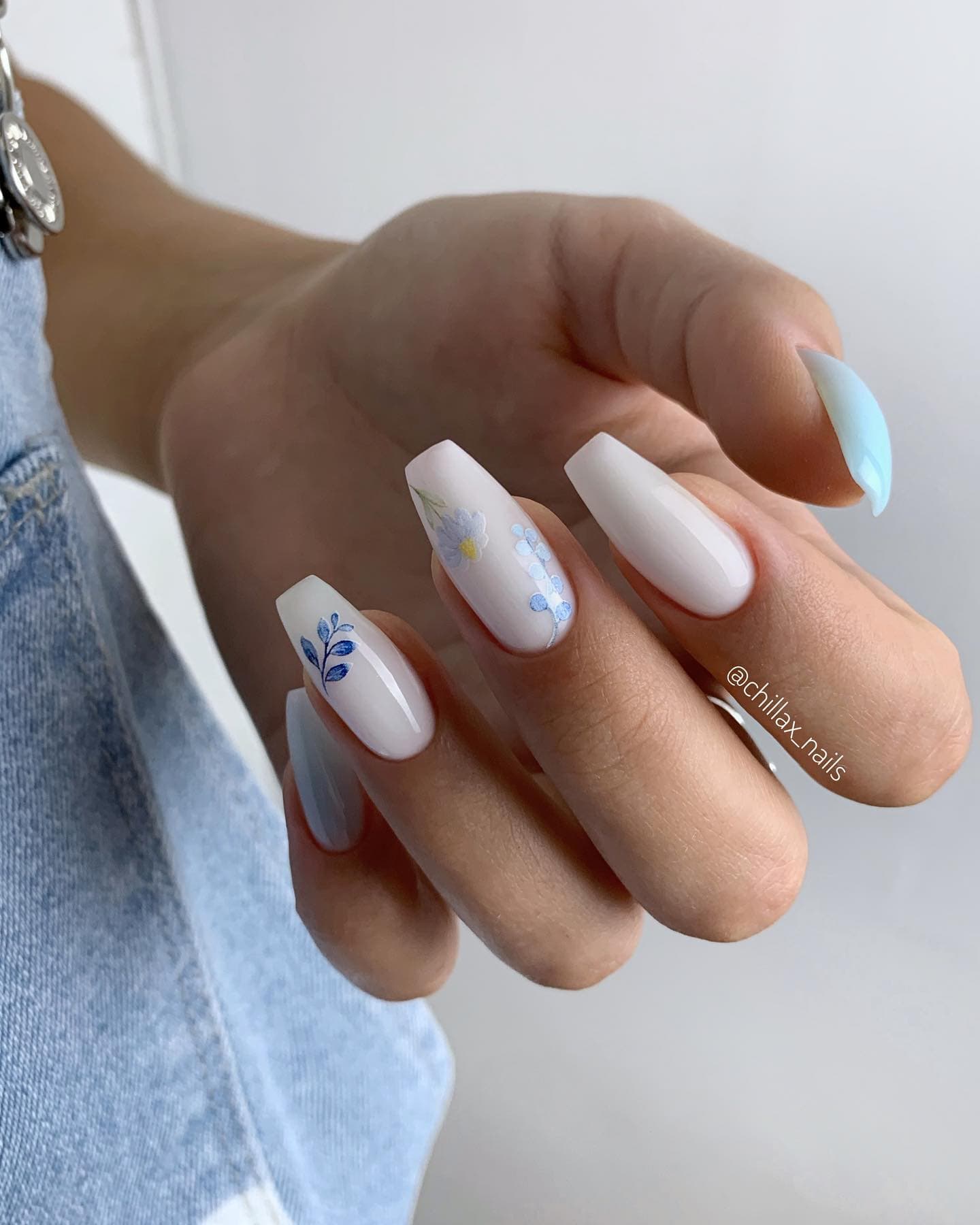 Белый с голубым или синим – это очень нежное сочетание цветов. Для дизайна ногтей могут быть использованы как цветные стразы на белом фоне, так и роспись или наклейки.