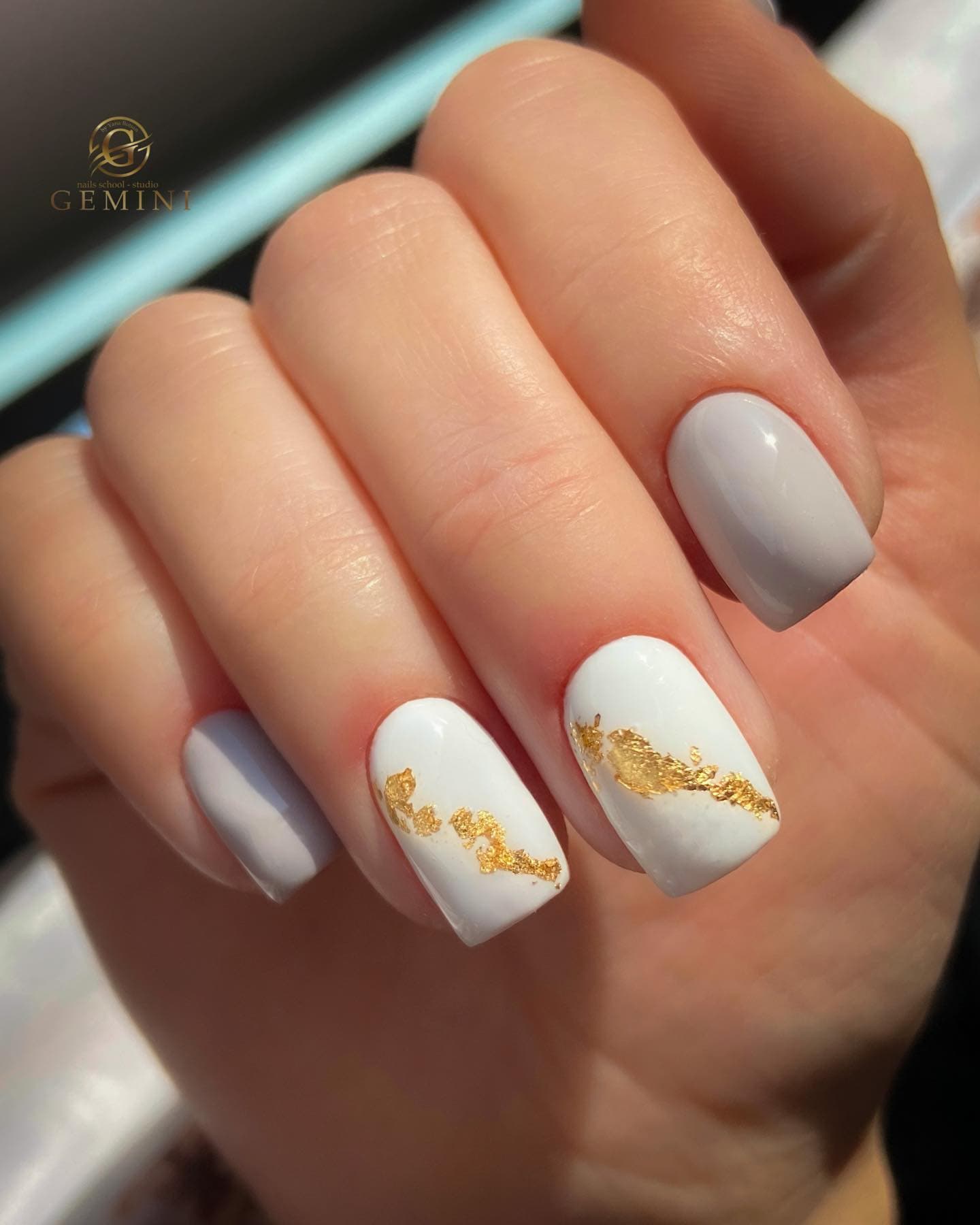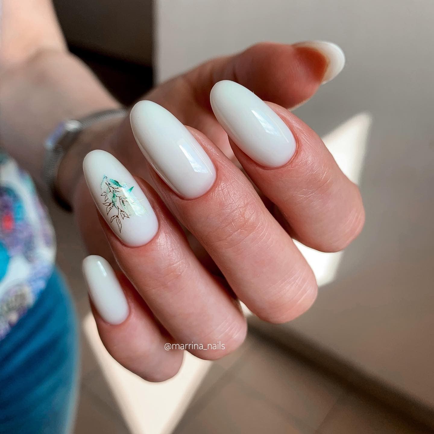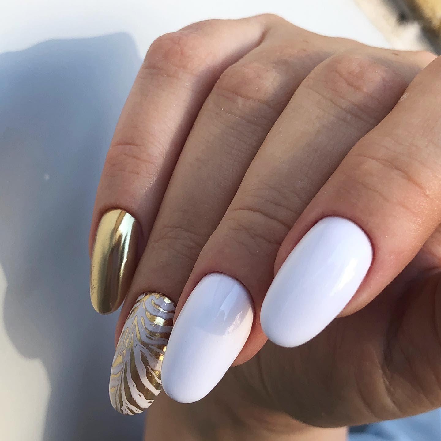 На белоснежном фоне можно поиграться с оттенками фольги. Самые популярные варианты: золото и розовое золото. Фольгу можно тоже заматировать или оставить блестеть. К ней подойдут мелкие блестки и графичные узоры.