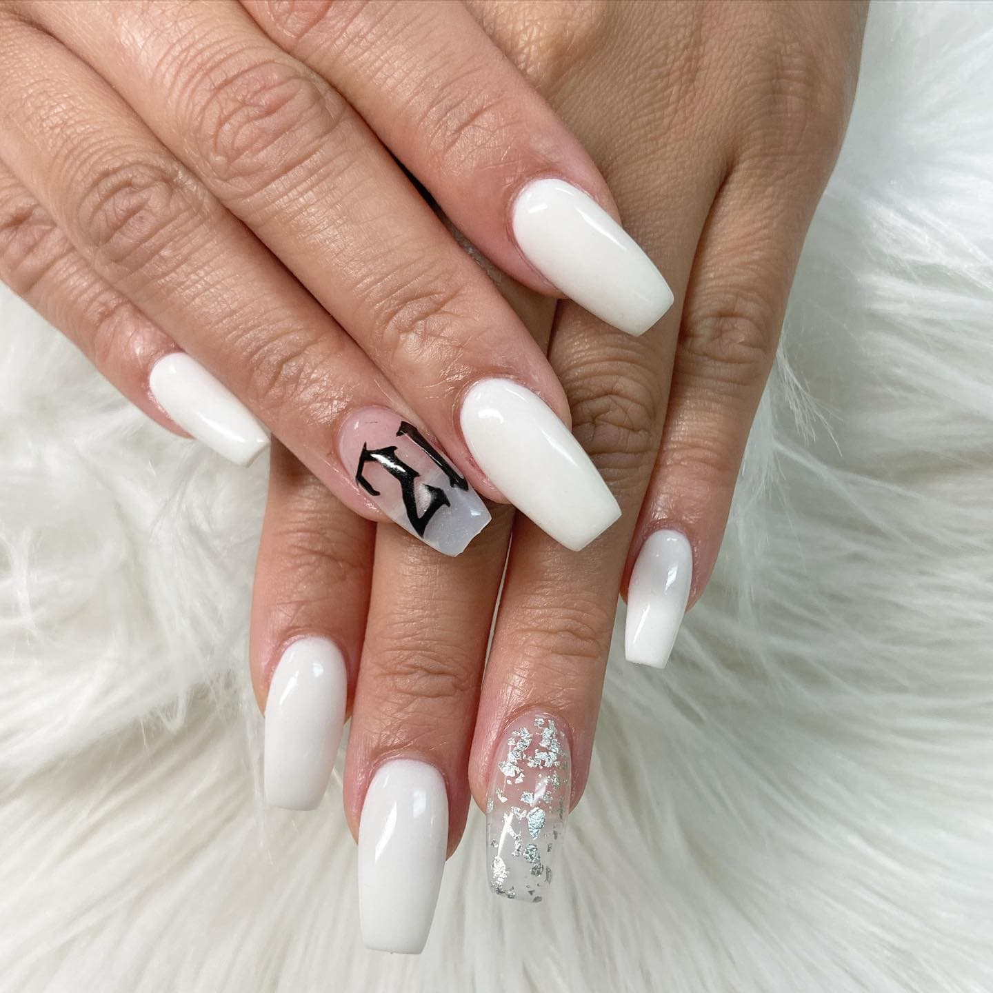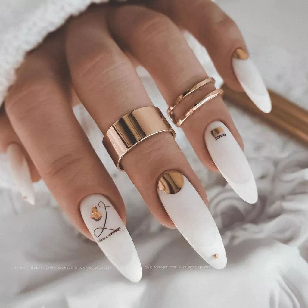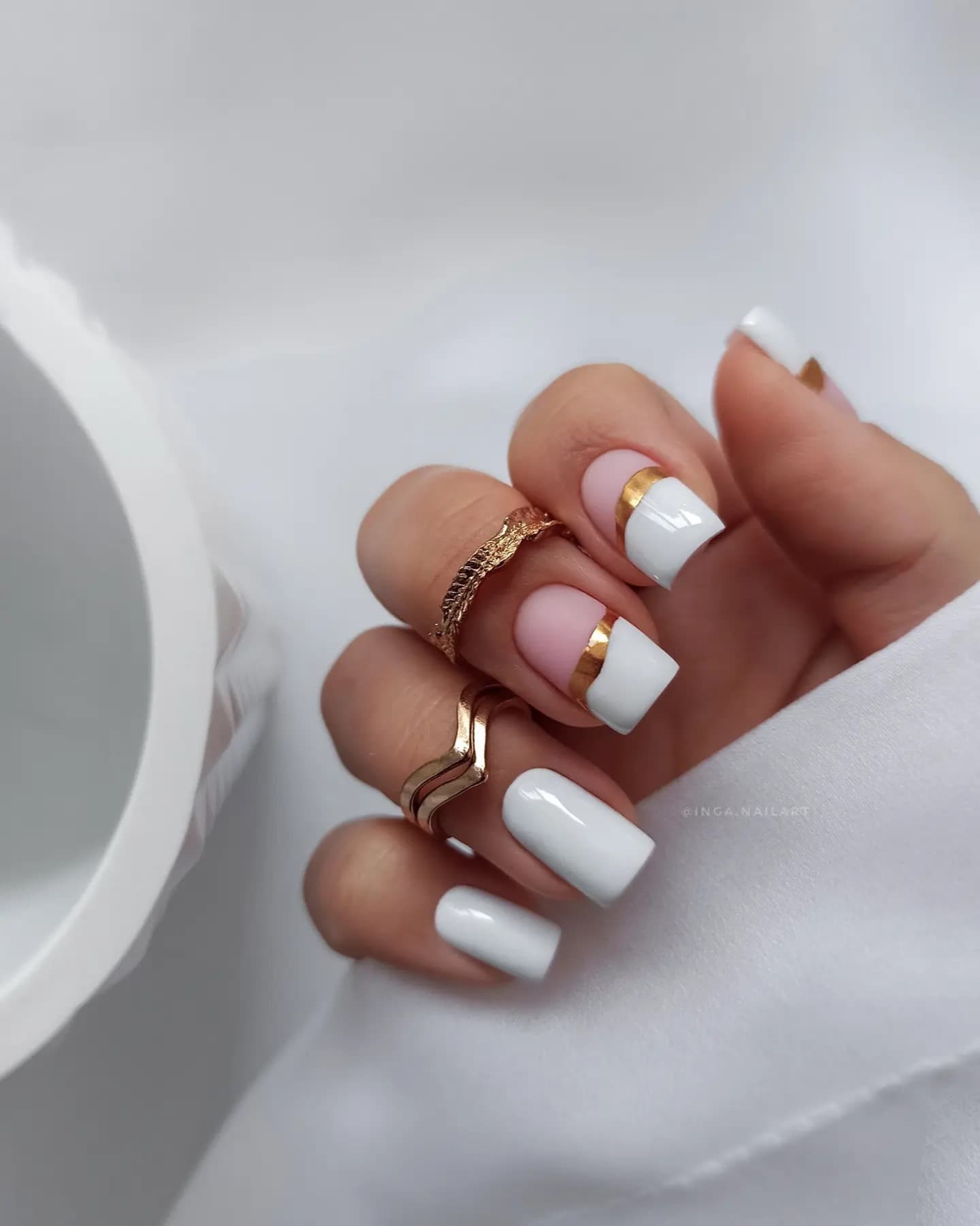 На белоснежном фоне можно поиграться с оттенками фольги. Самые популярные варианты: золото и розовое золото. Фольгу можно тоже заматировать или оставить блестеть. К ней подойдут мелкие блестки и графичные узоры.