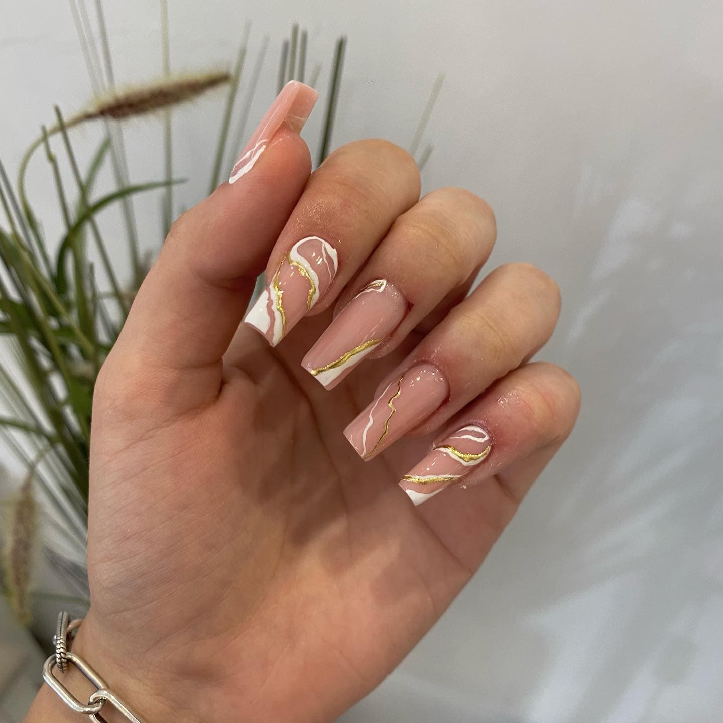 Мрамор снежного цвета можно сделать с черными, зелеными, золотыми или розовыми прожилками. Камень может находиться на одном или нескольких ногтях, а в целом сделан в цвет прожилок. Матовые бесцветные ногти с белыми прожилками подойдут для тех, кто не любит яркие варианты.