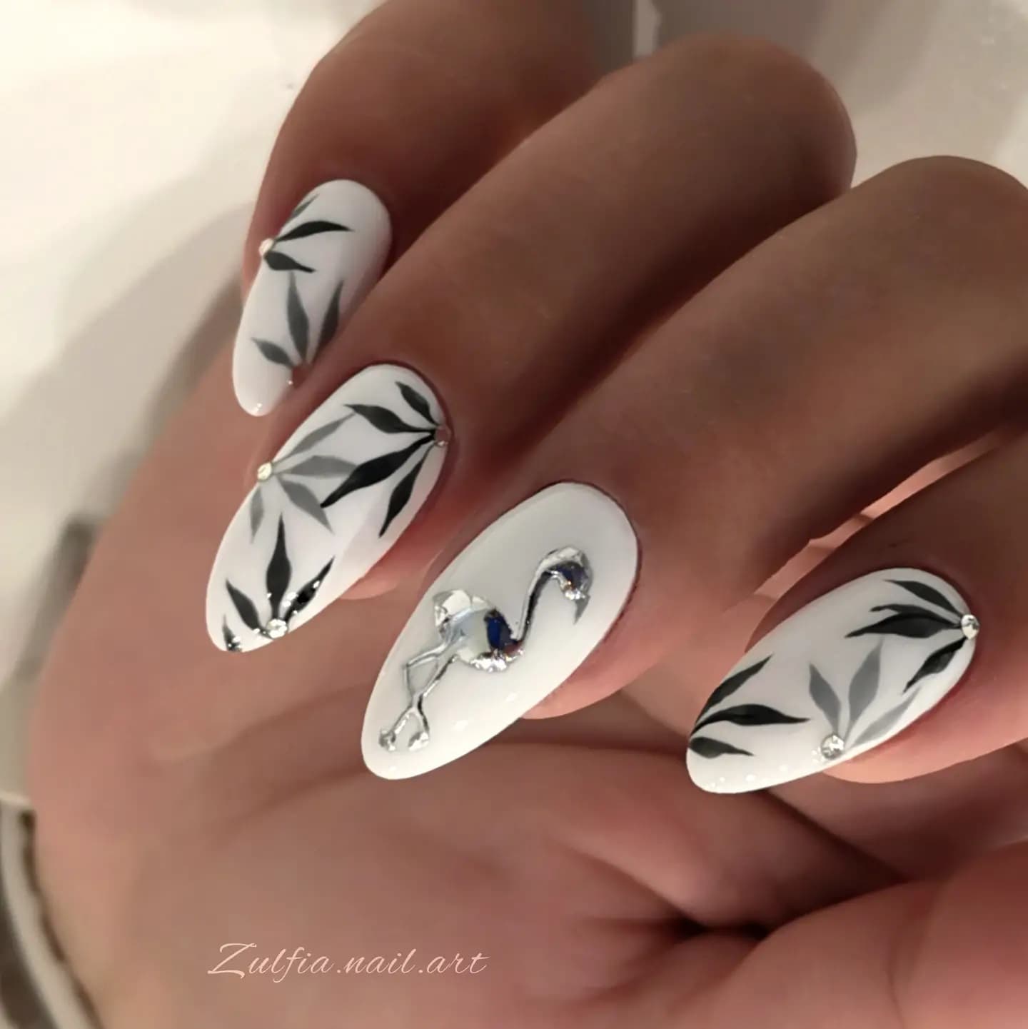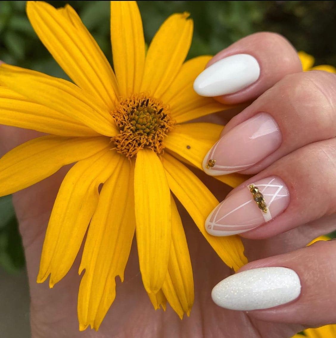 На белой основе выразительно, эффектно и интересно будут смотреться практически любые узоры. В текущем сезоне 2021-2022 гг. особую актуальность приобрела геометрия с ее четкими, прямыми линиями. Для реализации подобных идей можно использовать различные техники и способы декорирования – штампы, тончайшие кисти, фольгированные ленты и т.д. Выбор рисунка целиком и полностью остается за вами. Это могут быть ромбы, полоски, зигзаги, треугольники и любые другие фигуры. Для придания акцентов и интересных деталей нейл-арт может украсить блестками, стразами или кусочками фольги.
