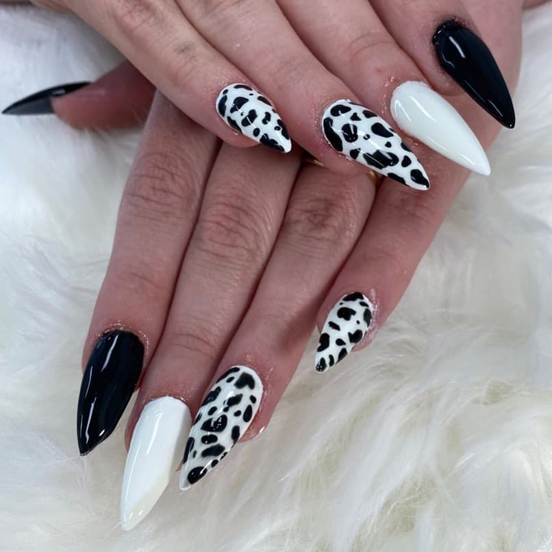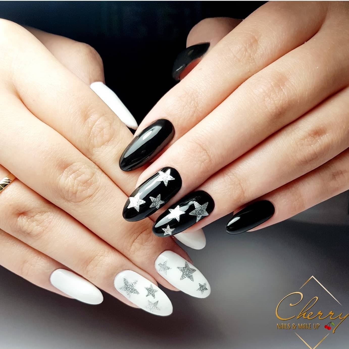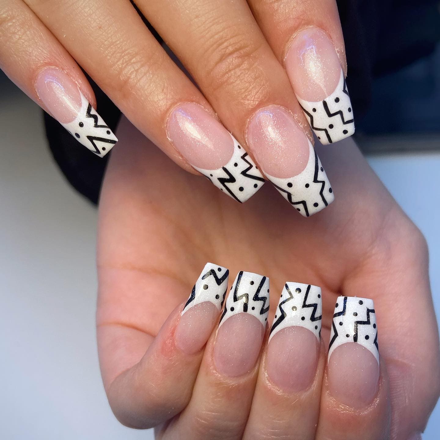 Черно-белый маникюр также часто выбирают модницы для создания лука на каждый день. На белый фон может быть нанесен черный рисунок, чаще всего это лишь его контур, геометрический узор или орнамент.