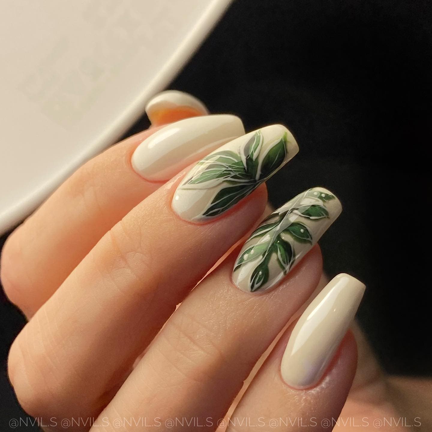 Контрастные нейл-арты всегда вызывали интерес у девушек. Сочетание светлых оттенков с черным цветом выглядит выразительно и очень заметно. На молочном фоне отлично смотрится темное кружево с добавлением шиммера, флористика с веточками и нежными листьями.