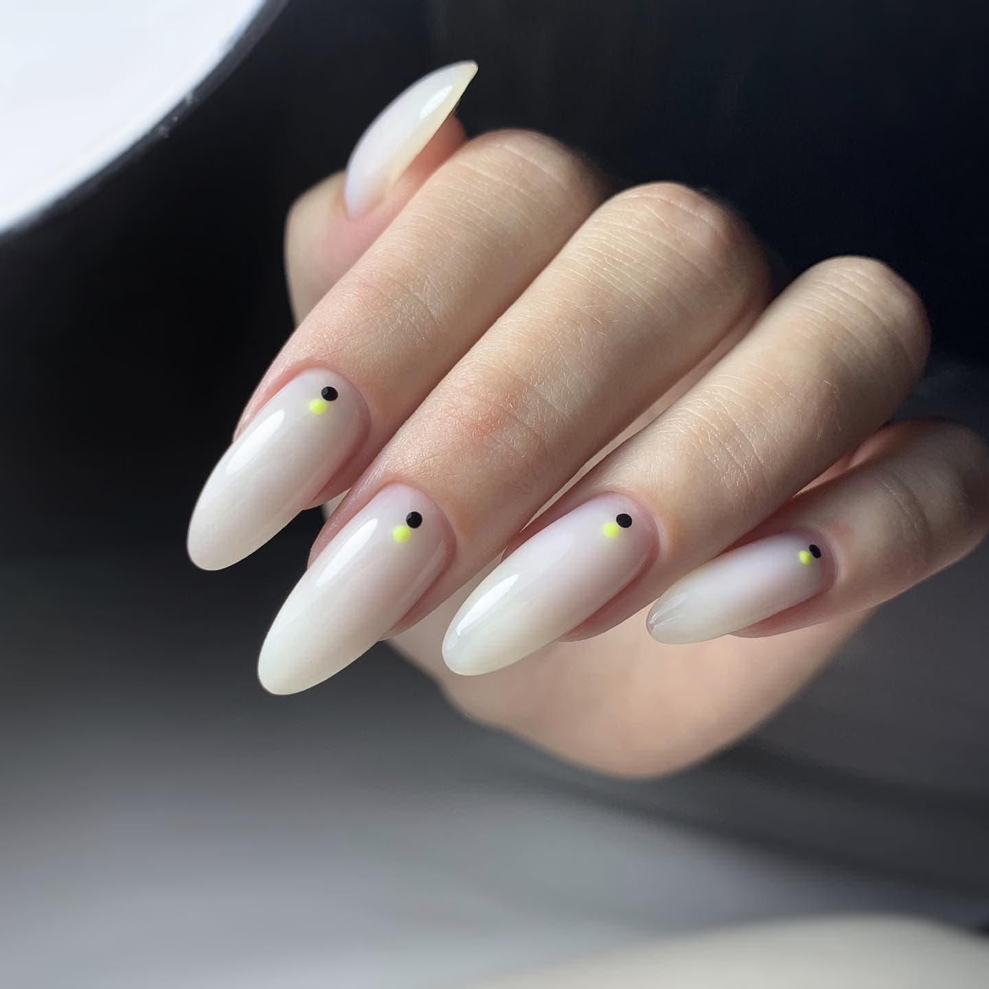 Тренд последних сезонов – декор с помощью черного геля-тянучки. Для создания стильного дизайна достаточно нанести небольшое количество геля поверх молочного фона, добавить черные стразы, глиттер и другой блестящий декор. На молочном фоне отлично смотрится маникюр с дизайном минимализм. Например, можно дополнить молочный маникюр точками, абстрактными узорами, волнами, штрихами.
