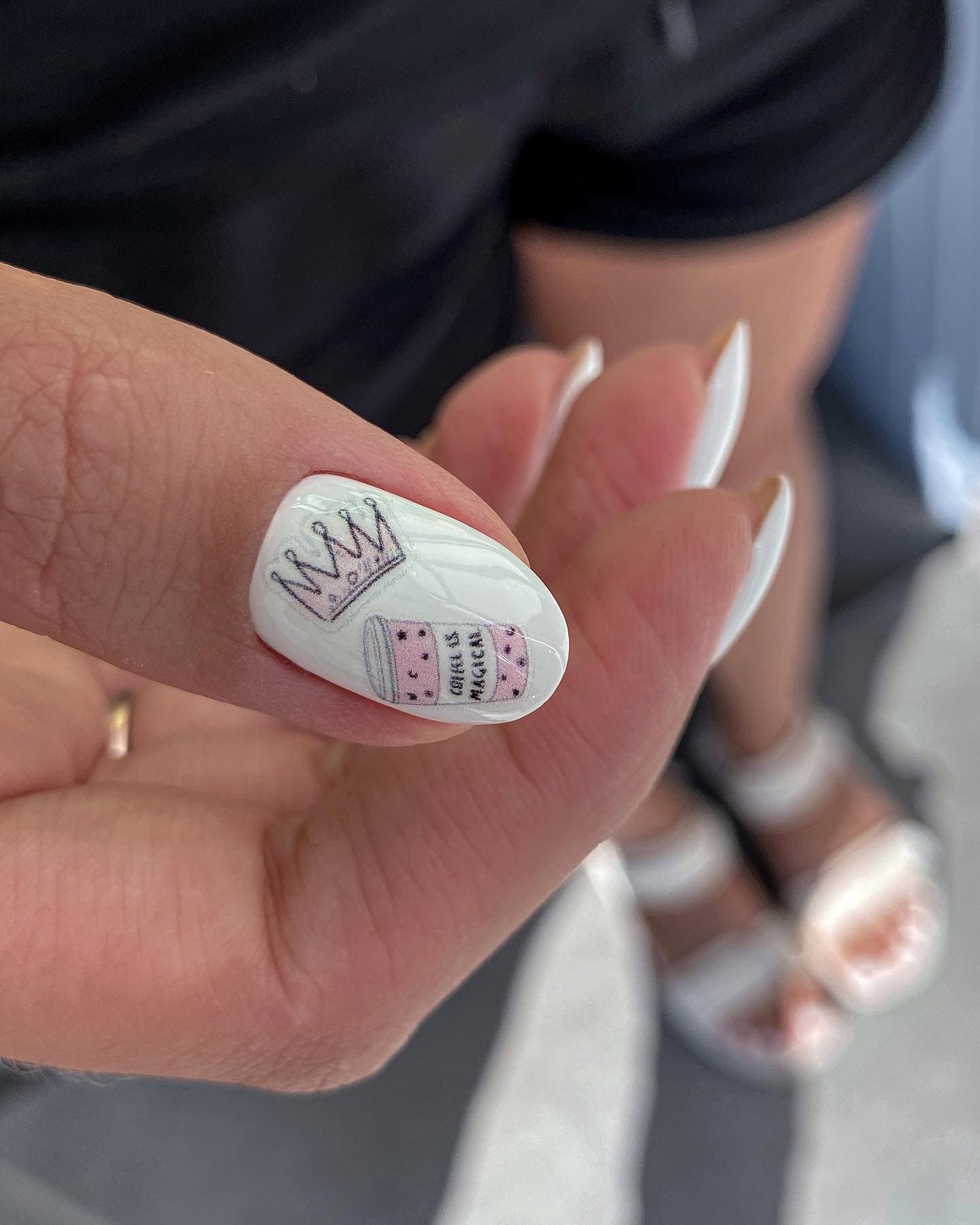 Если вы решили дополнить белый маникюр декором, то разместите его на 1-2 ноготках. Также не стоит выполнять на коротких ногтях ахроматические нейл-арты, где сочетаются черный и белый, красный и белый. На короткой длине такое сочетание не сможет по-настоящему раскрыться и показать себя.