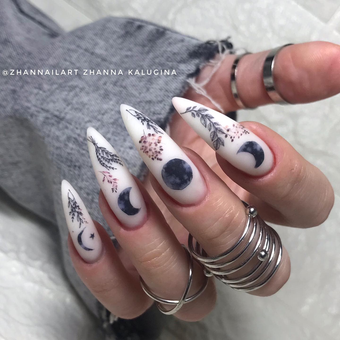 Лунный дизайн с матовым эффектом будет выглядеть необычно. Переливы не такие яркие, но заметные. С ними хорошо будут смотреться рисунки звездочек или простая геометрия на белом фоне.