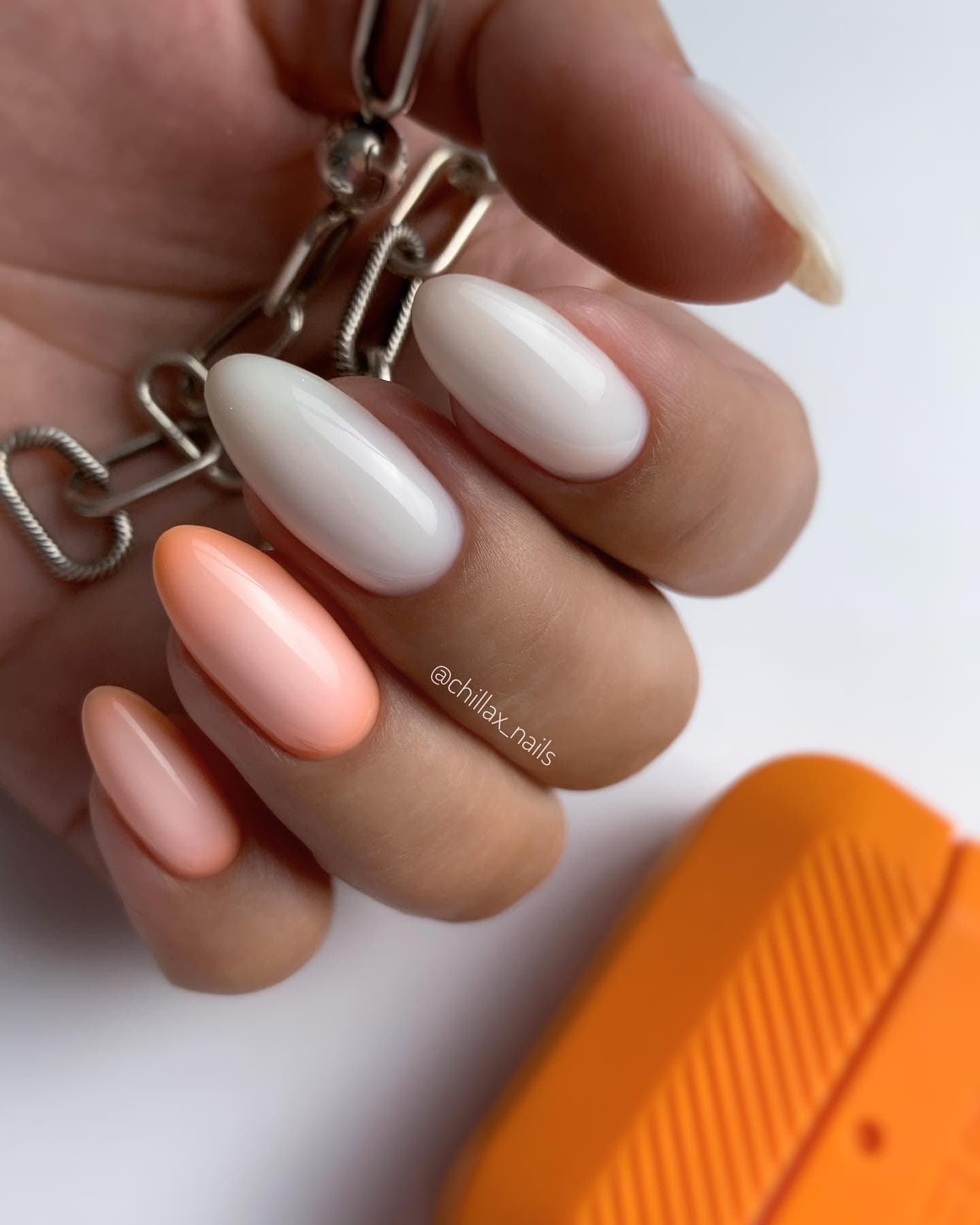Эффектный и привлекающий внимание дизайн – омбре или градиент в светлых оттенках, который просто великолепно смотрится на миндалевидной форме ногтей