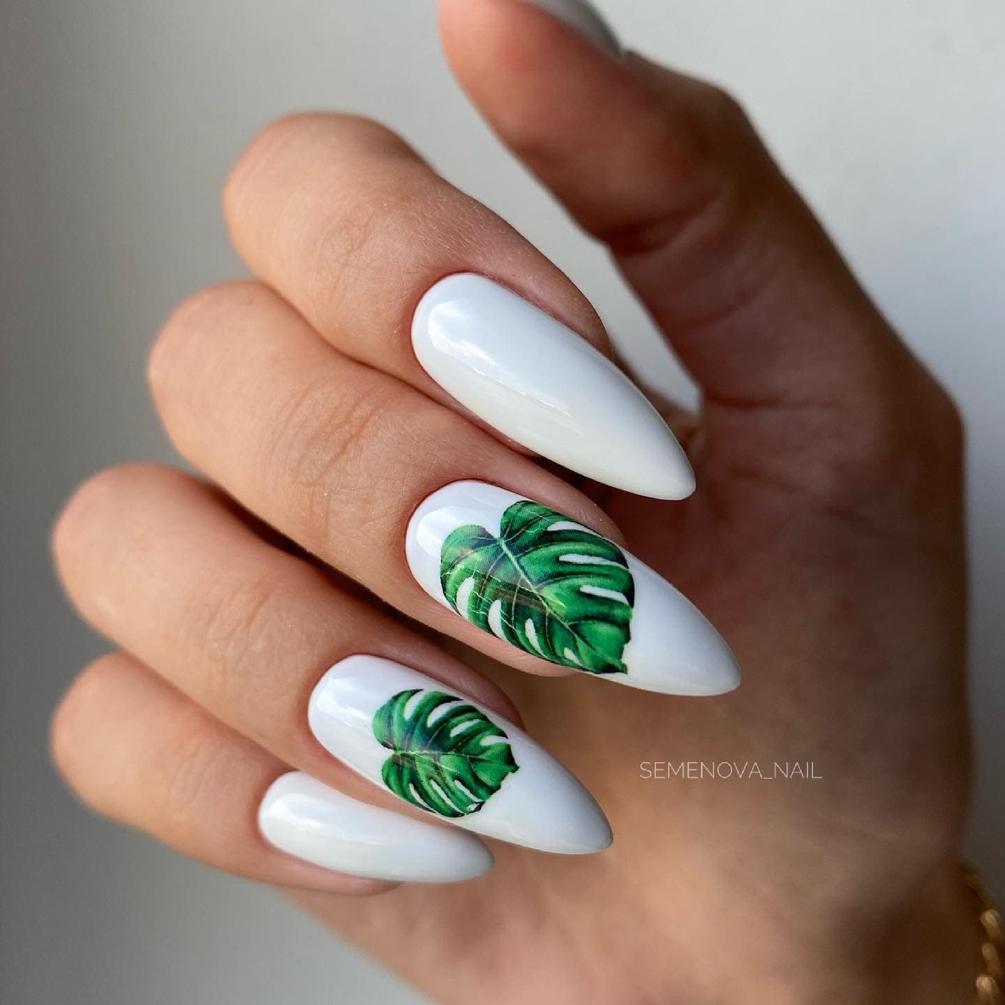 - Если ваши ногти круглой или овальной формы, то лучше отдать предпочтение цветочному или тропическому принту. В случае с квадратными ногтями, идеальным вариантом станет геометрический узор.