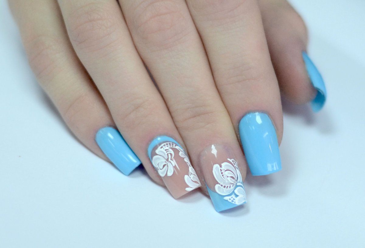 Бирюзовый френч сам по себе смотрится очень нежно и воздушно, поэтому украшать ноготки следует соответствующими рисунками. Разнообразные цветочки, веточки, скромные бутоны и тонкие травинки актуальны в этом случае как никогда. Дополните френч нежными полевыми цветами, благородными орхидеями, белоснежными ромашками, пионами или любыми другими цветами, которые гармонично смотрятся с бирюзовой палитрой. Располагать флористику лучше на одном-двух акцентных ноготках, используя для прорисовки деталей более тёмные или светлые лаки. Цветочные рисунки очень красиво сочетаются с глиттером и стразами, что также можно взять на заметку и обыграть в дизайне.