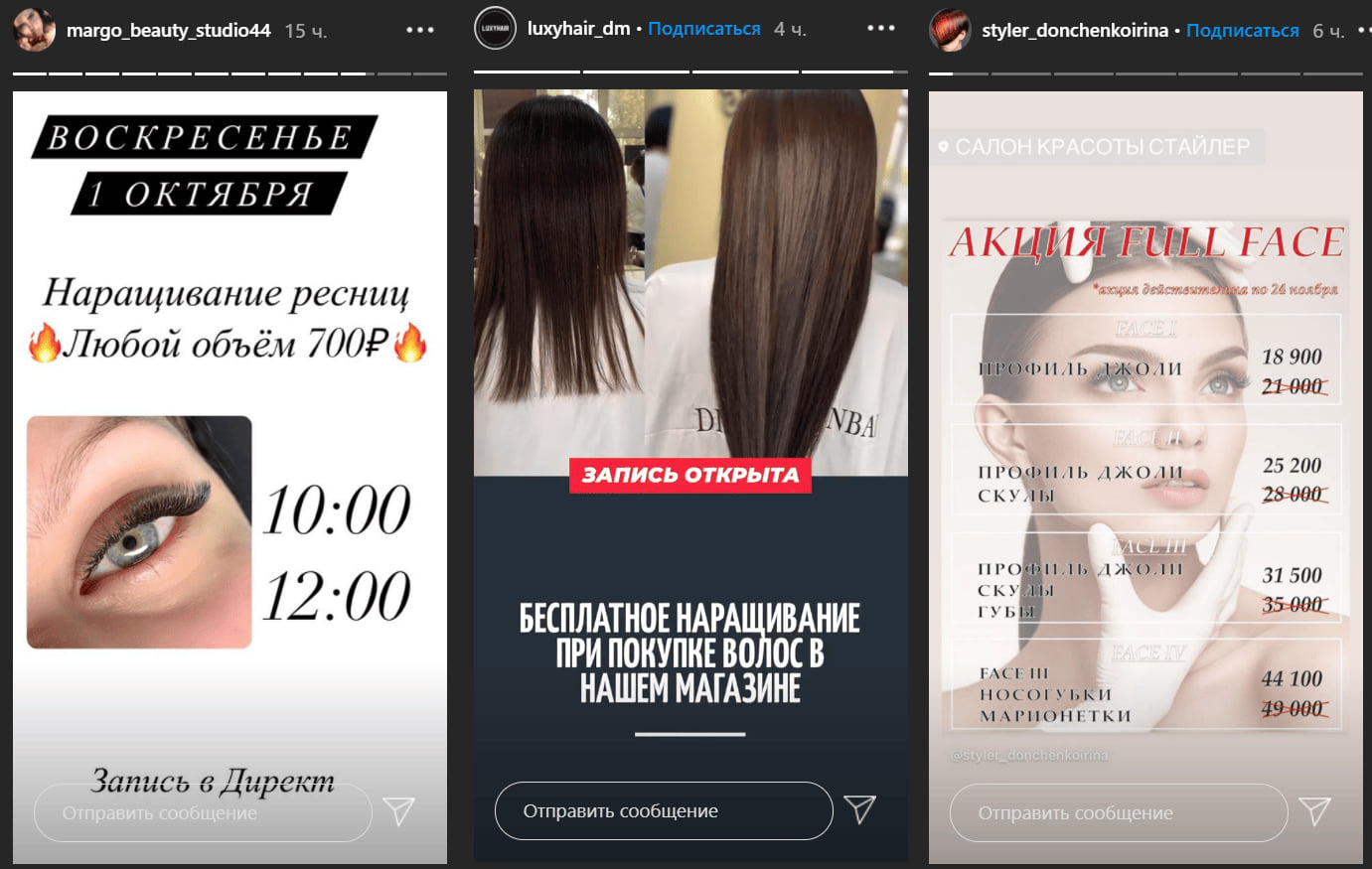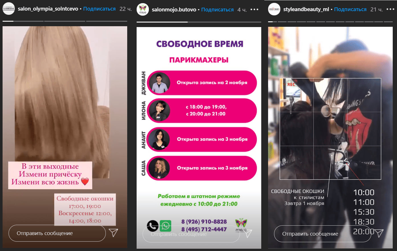 Еще один формат продающего контента, который часто встречается в аккаунтах салонов красоты — «окошки» в Инстаграм* Историях. Опубликовав свободное время для записи на ближайшие дни, вы можете заинтересовать тех, кто хочет сделать процедуру быстрее, и избежите простоя мастеров.