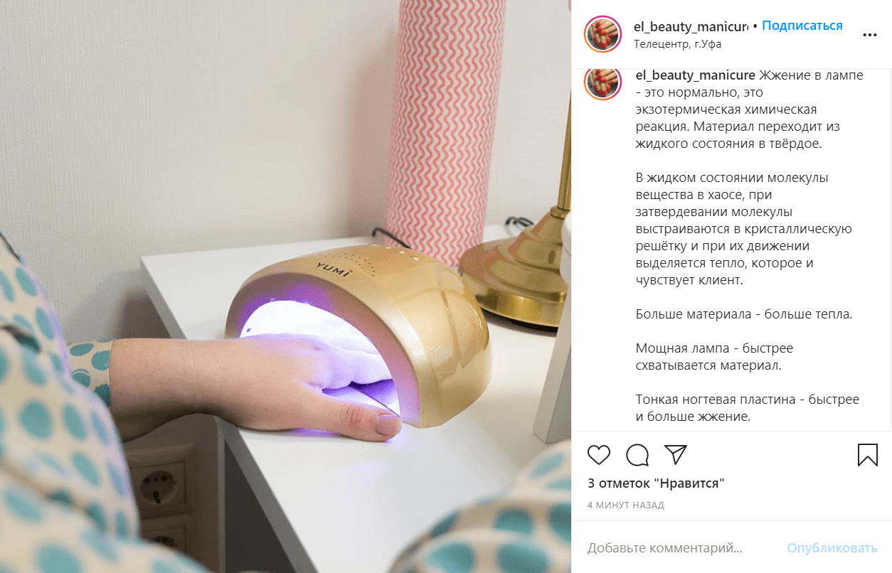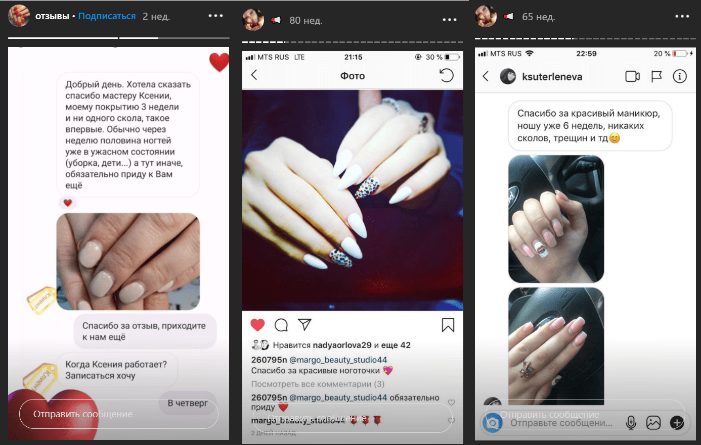 Фото работ — хорошо. Но у салона красоты есть много других вариантов для интересного визуального контентна. В отличие от работы юриста или бухгалтера, труд мастера маникюра можно показать на фото или видео, и это не будет адски скучно. Этим можно и нужно пользоваться.