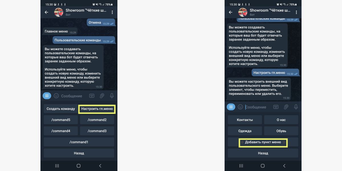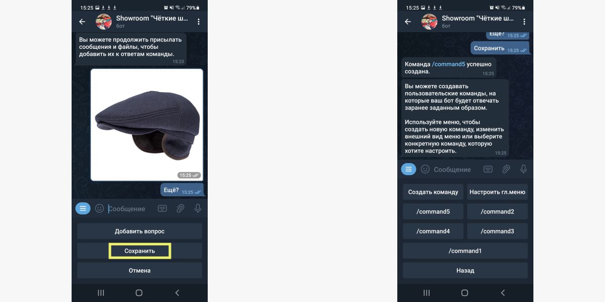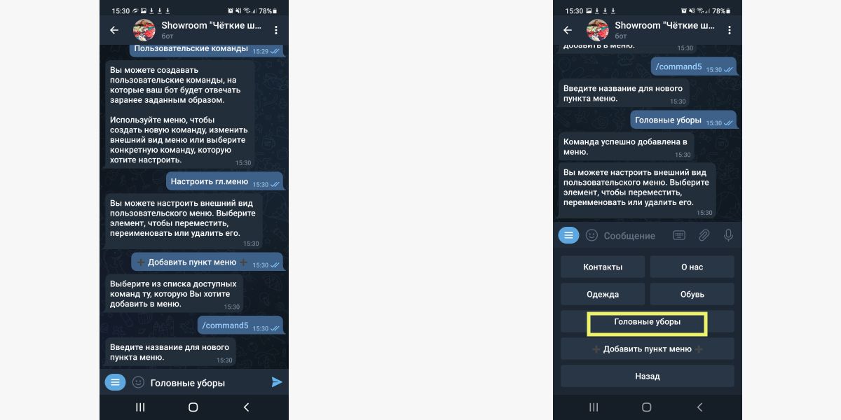 Вводим название пункта меню «Головные уборы», отправляем боту это сообщение, и готовый пункт с этим названием появляется в меню.