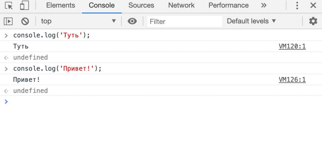 В консоли можно не только писать код, но и выводить туда результаты. Давайте для начала сделаем самую простую программу, которая отобразит в консоли слово «Привет!». Для этого используем команду
