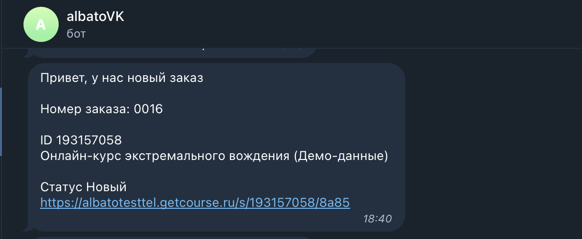 Так выглядит сообщение от персонального Telegram-бота. Он оповещает о новом заказе из форм ВКонтакте.