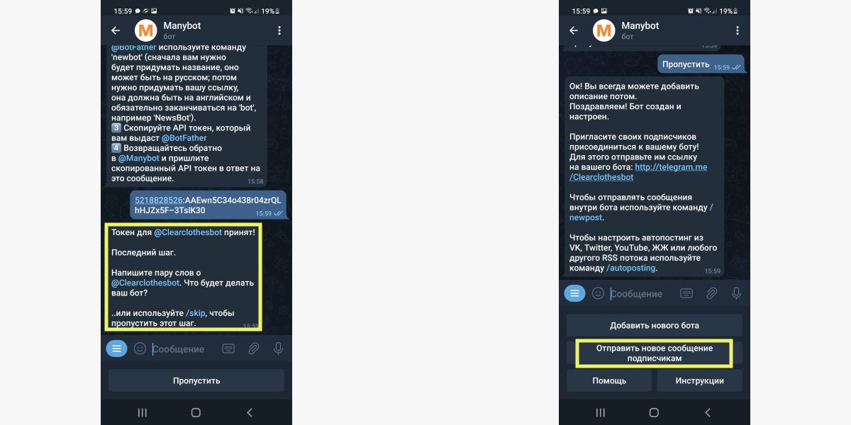 А теперь нужно следовать инструкциям, которые будут отправлены в чат, и подключить нового бота. Для этого нажмите здесь: