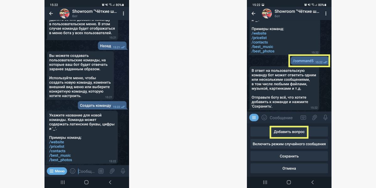 Команда создается так же, как и в BotFather – вводим commands и номер. У нас команда уже пятая, так как мы тренировались и настраивали бота и его команды.